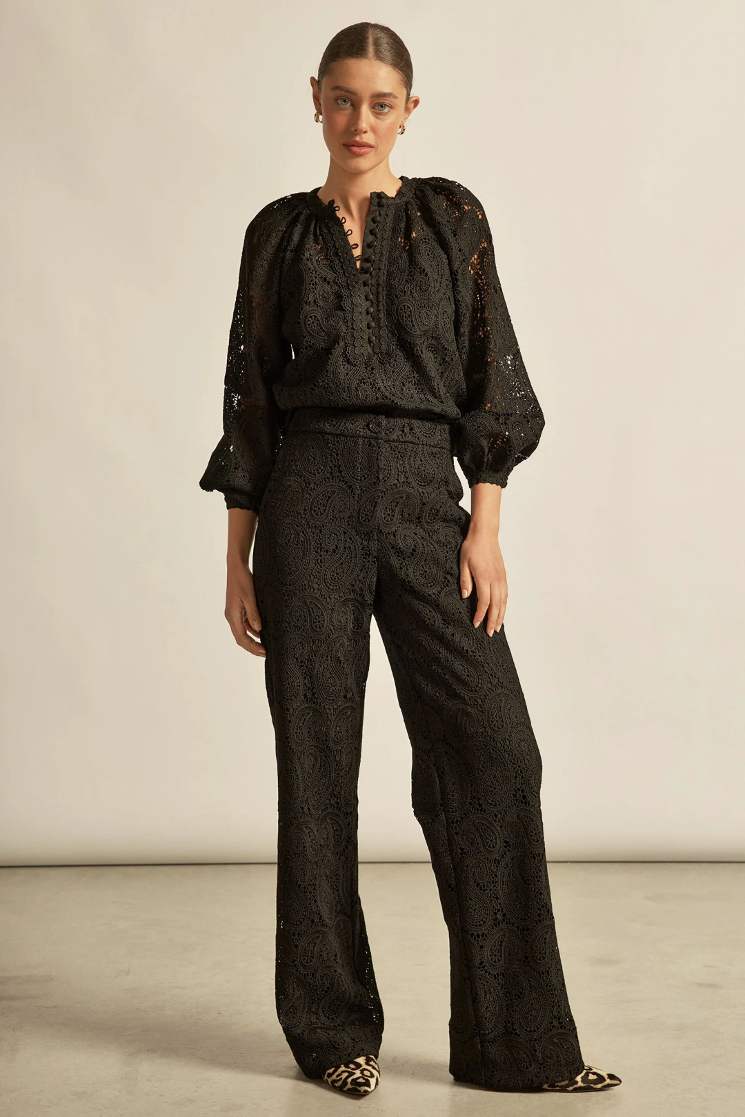 crafted in a 70s-inspired paisley poly-lace