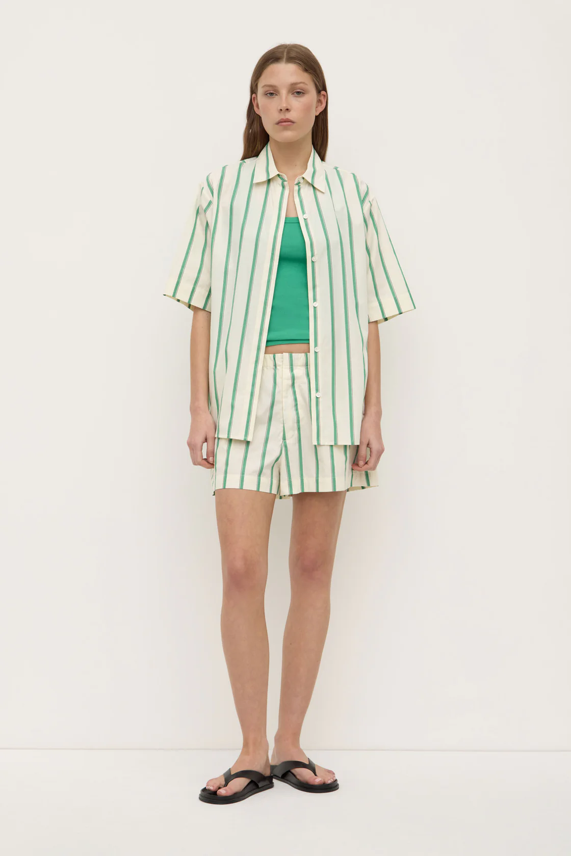 Relaxed fit short sleeve shirt in a dual stripe design. Features a button front and curved hem for ease of movement. Can be paired with the matching Agnes Stripe Short.