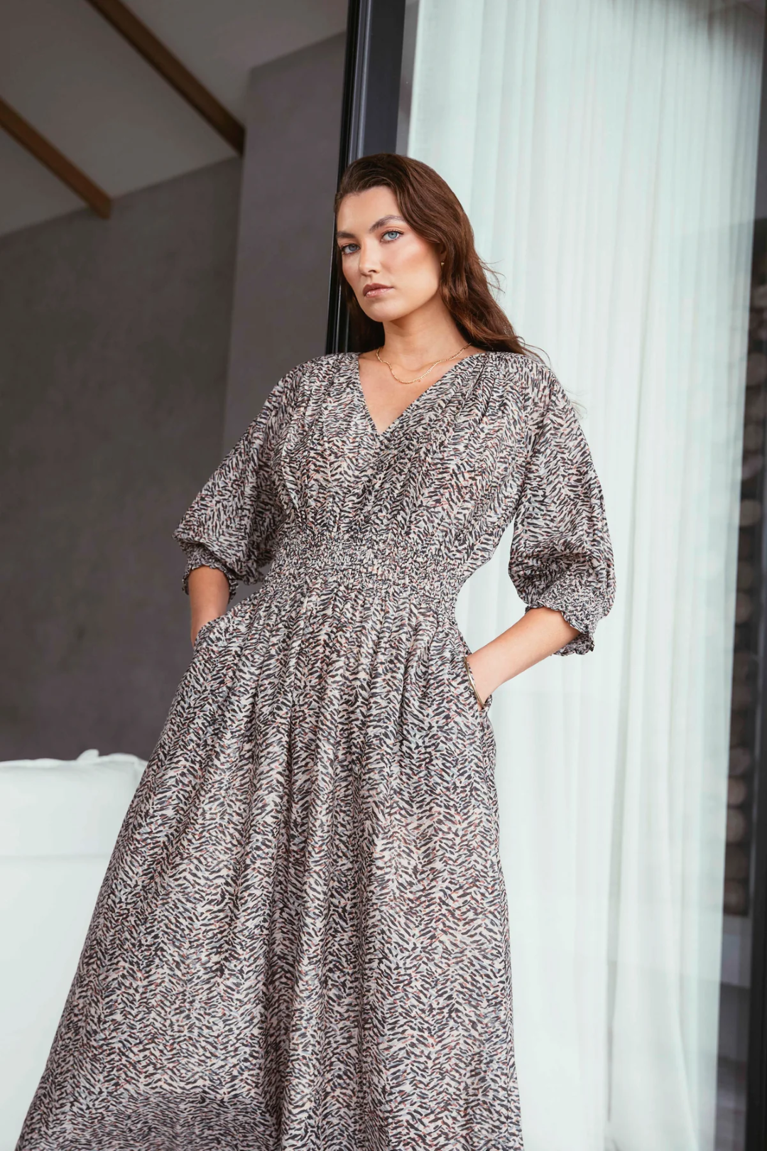 Meet the Aman Dress - where effortless summer style meets refined elegance. Crafted from a luxurious cotton-silk blend with a soft, subtle sheen, it features a bespoke in-house print. This maxi dress features a flattering V-neckline with pleat detailing, voluminous raglan sleeves finished with shirred elastic cuffs, and a shirred elastic waist for a comfortable, flattering fit. Perfect for long lunches, evening BBQs, or relaxed summer days. Style with slides and raffia accessories for a complete summer-ready look.