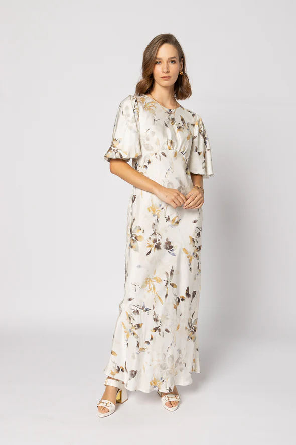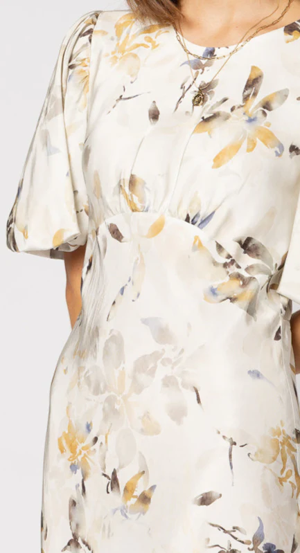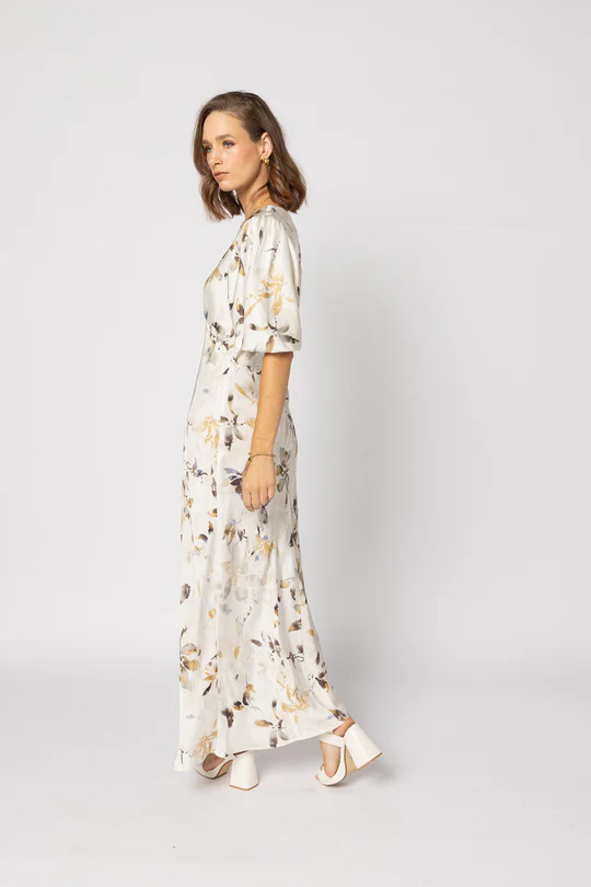 Amara Dress, an exquisite choice for your next special occasion. This elegant garment showcases a sophisticated crew neckline adorned with a back button and keyhole detail. The puff sleeves add a touch of whimsy, while the flattering yoke design at the front enhances the dress's maxi length. For ease of wear, a discreet zipper is located at the back. Elevate your wardrobe with the timeless charm of the Amara Dress. Stunning Soft Floral Print.