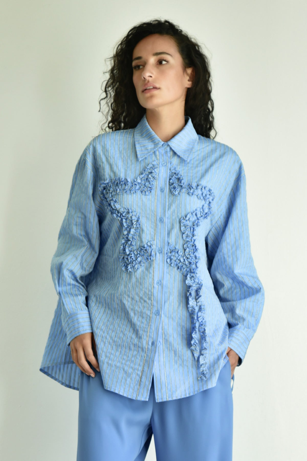 Let your staples do the talking with the ‘As Star as it Goes’ shirt. Boasting a ruffled self-fabric star, this edgy take on a classic button up serves for work or play and day to night. With a generous fit and a lightweight feel granted by its ‘Bragging Stripes’ cotton rich fabrication, this textured stripe shirt pairs back perfectly with clean suiting for high-fashion touch.