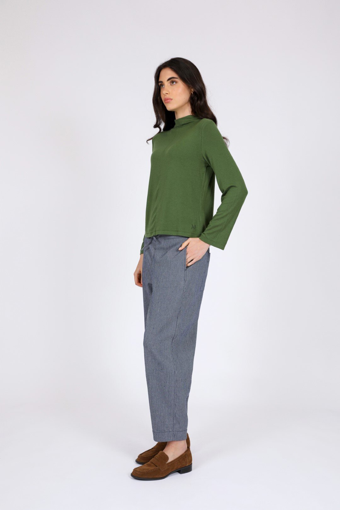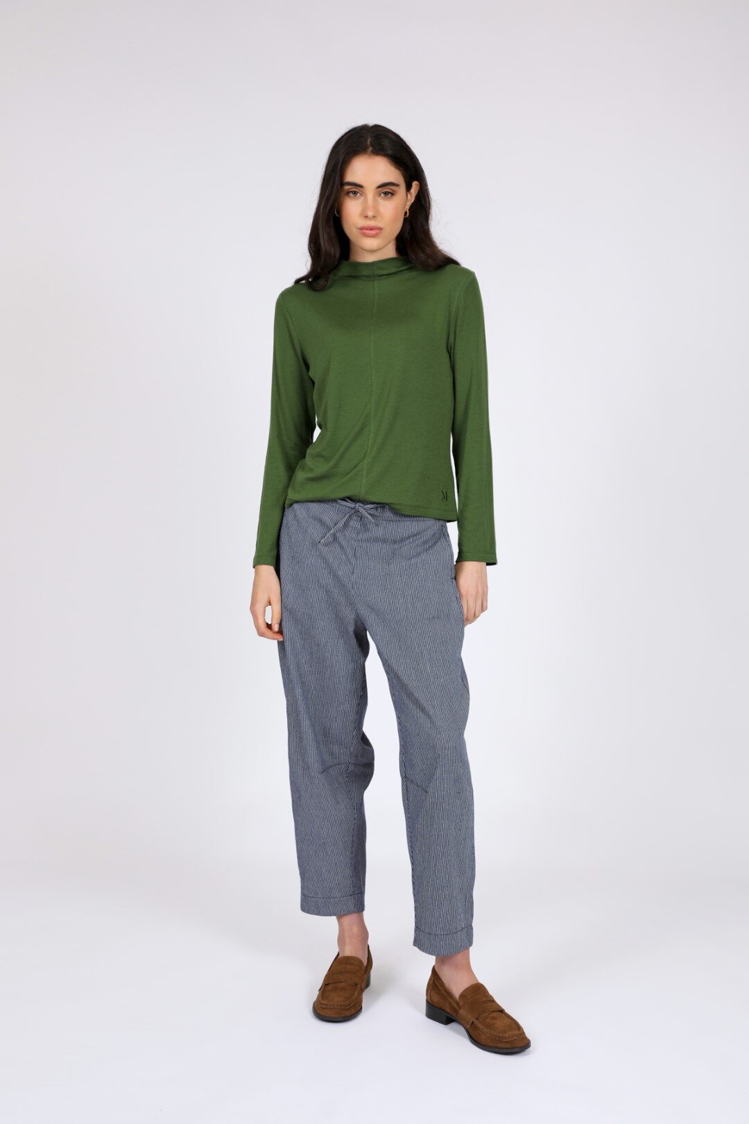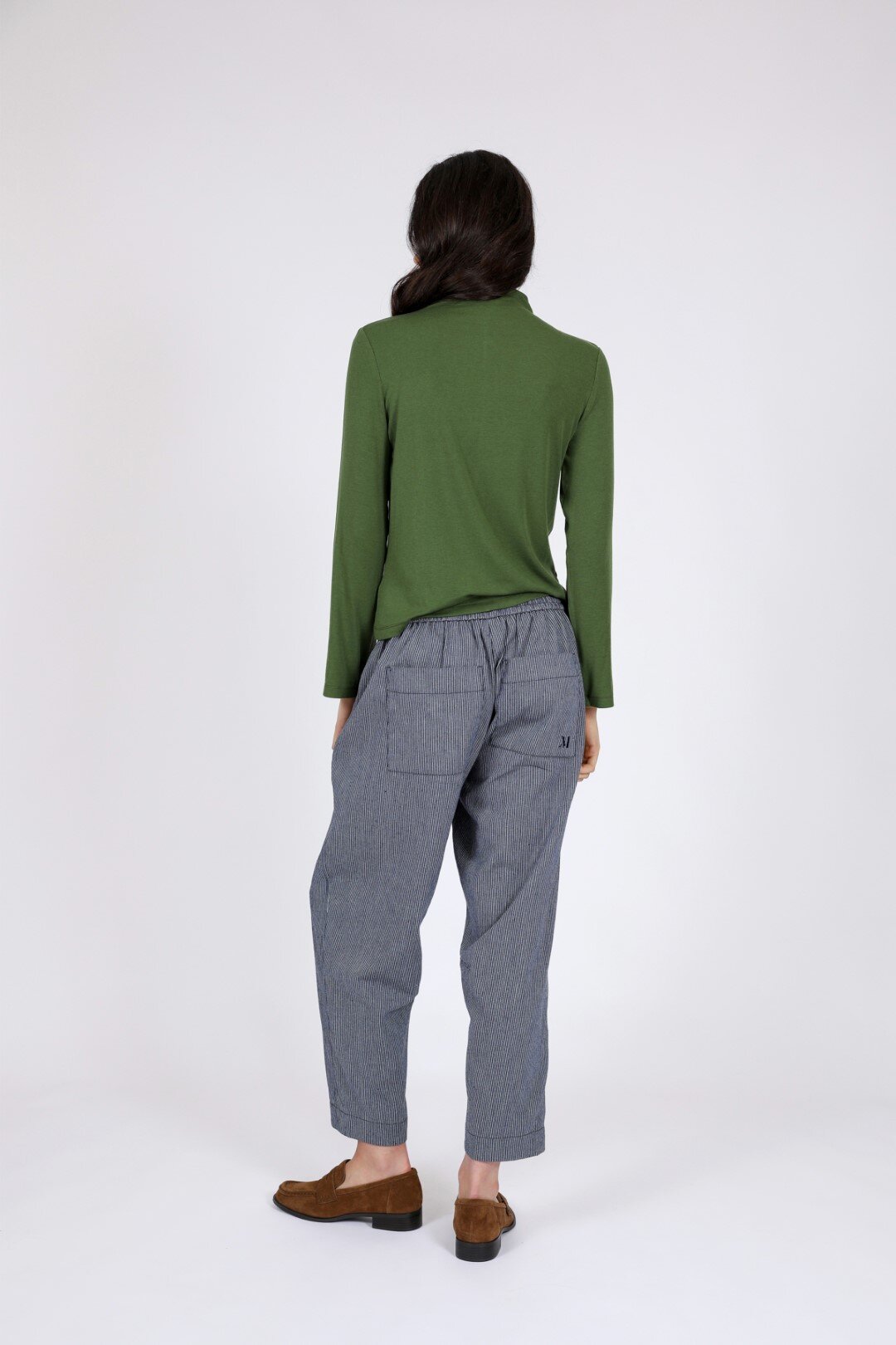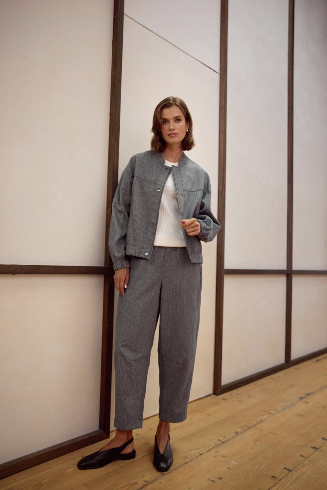 Meet your new favourite barrel pant - where the most - loved shape meets elevated comfort. Our Beam Barrel Pant in Ink Stripe is crafted from 100% breathable cotton. Designed in a relaxed fit with a subtle barrel silhouette, it’s finished with knee darts for gentle shaping. The mid to high - rise waistband features a clean flat front, an elasticated back for ease, and an adjustable self drawcord to customise your fit. Style it with the coordinating Beam Bomber Jacket to complete your autumn set.