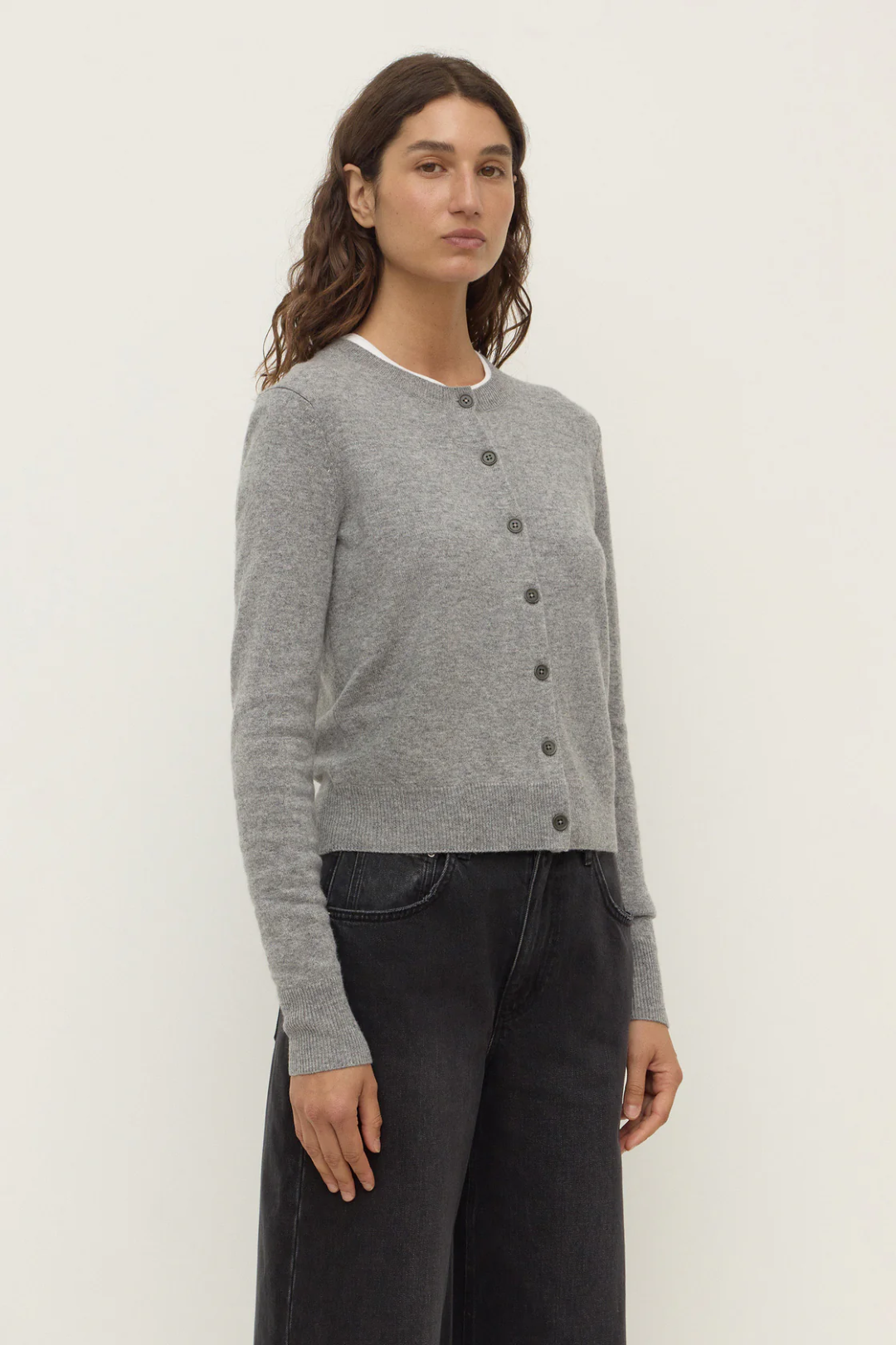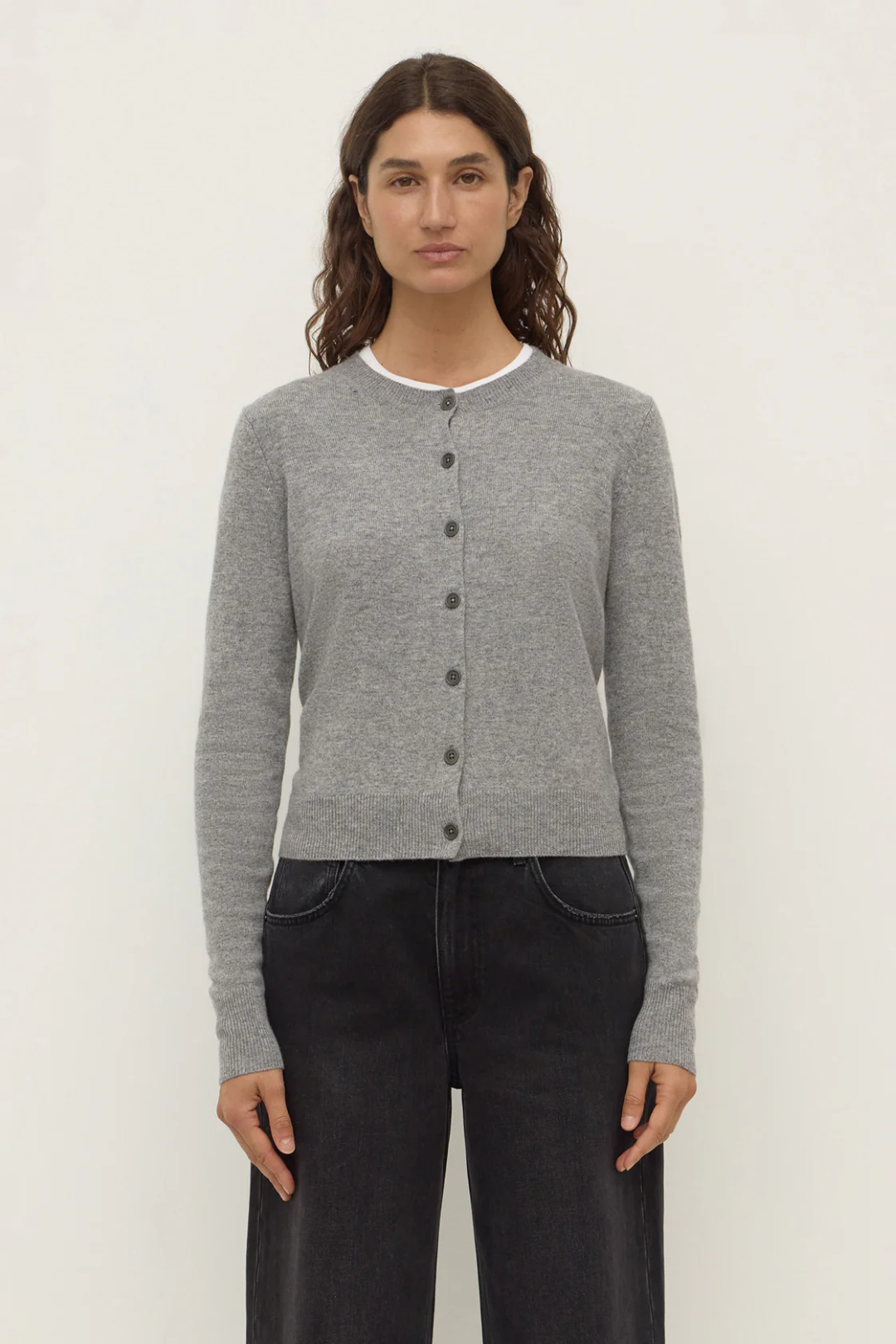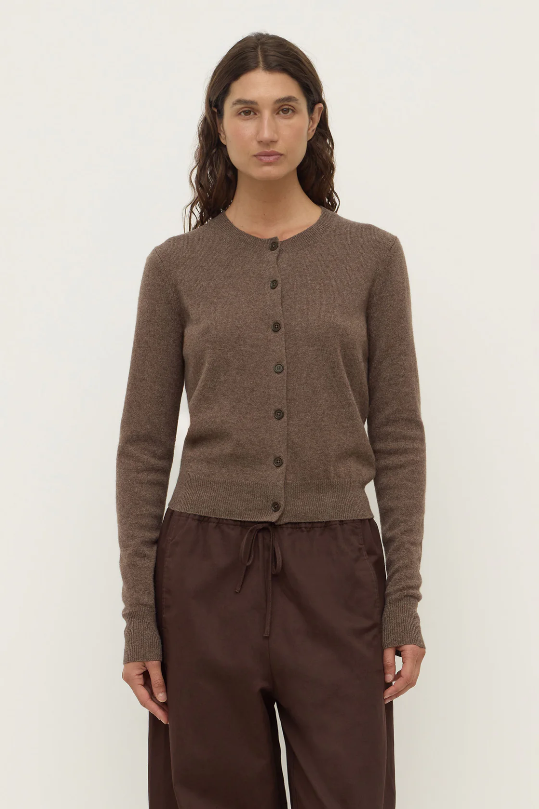 The Benny Knit Cardigan in cocoa marle is a wool blend knit cardigan with a slightly cropped length and crew neck.