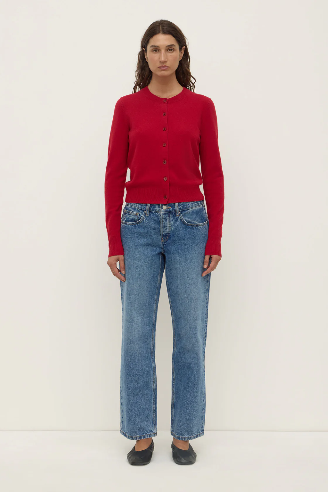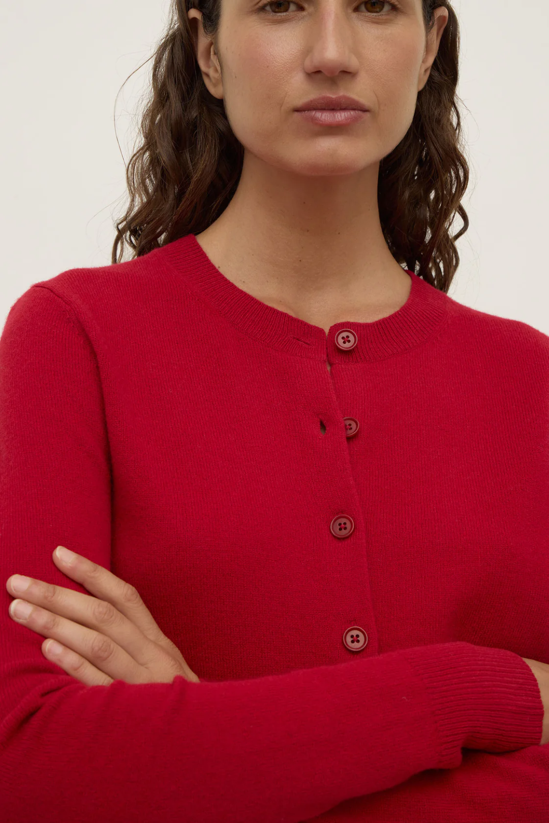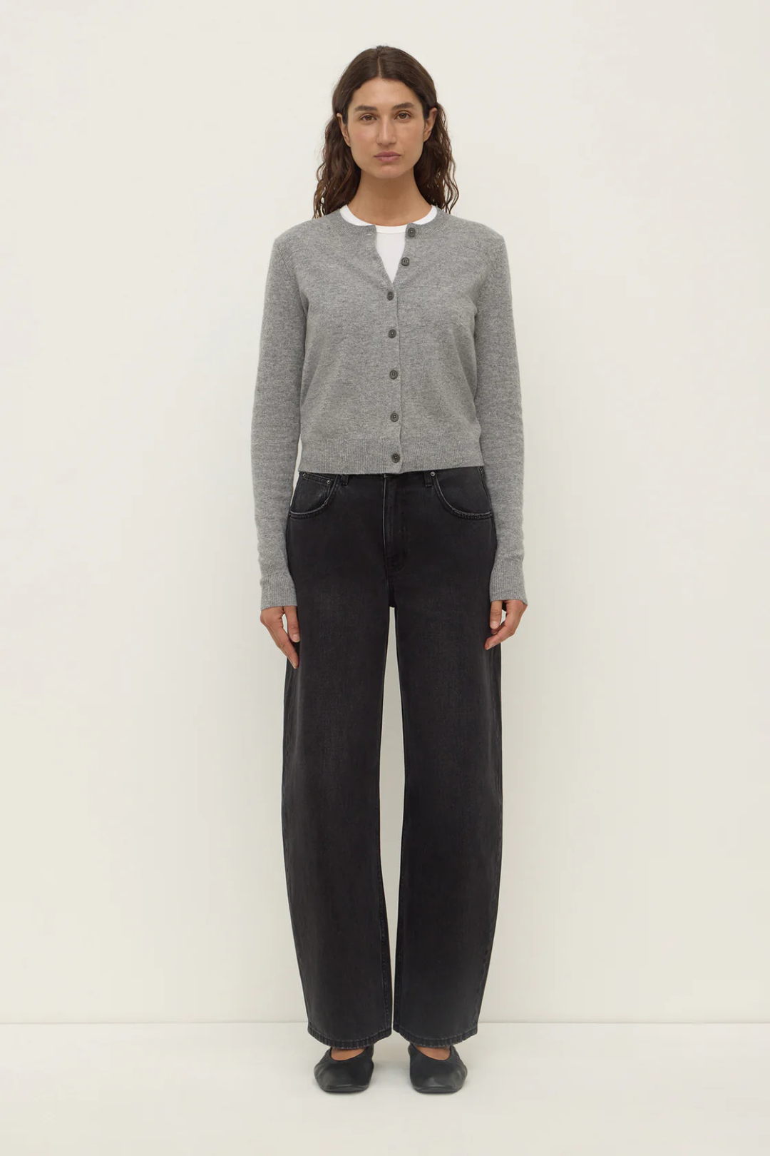 The Benny Knit Cardigan in cocoa marle is a wool blend knit cardigan with a slightly cropped length and crew neck.