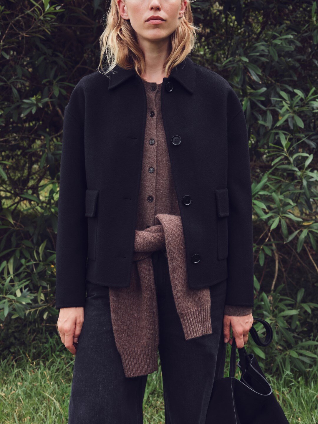 The Benny Knit Cardigan in cocoa marle is a wool blend knit cardigan with a slightly cropped length and crew neck.