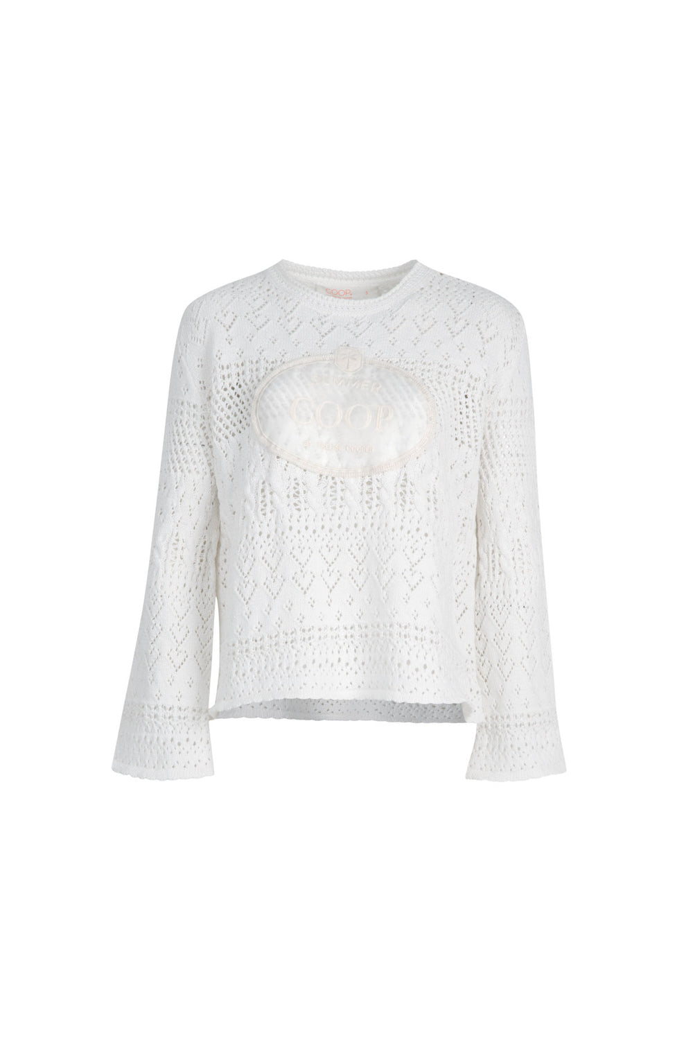 Relaxed yet distinctive, the 'Boho Breeze' sweater adds texture and charm to everyday layering. Knitted in our 'Mix It Up' cotton with an airy open weave, it’s designed with flared sleeves for a touch of drama and finished with an organza COOP brand patch at the front.