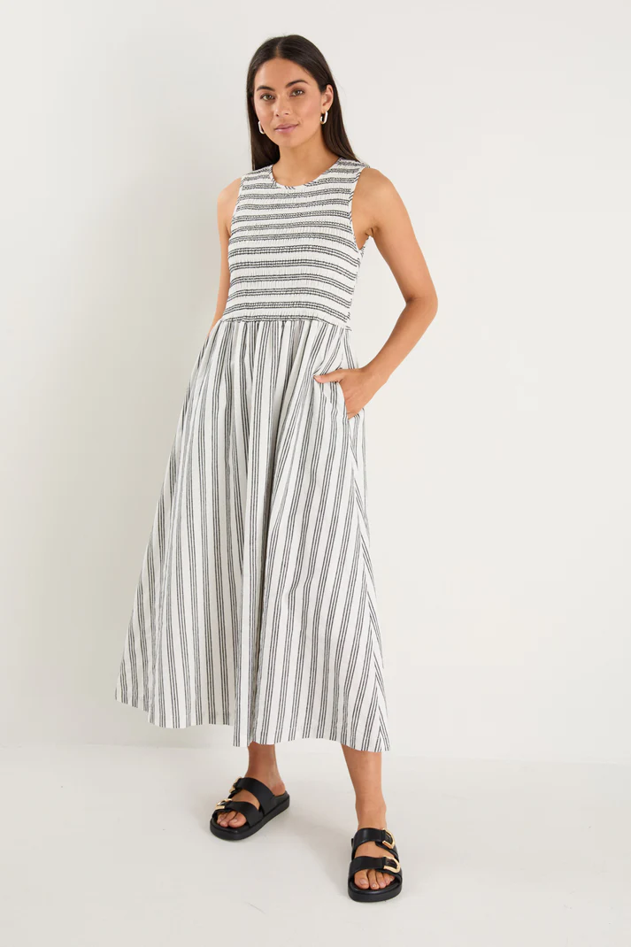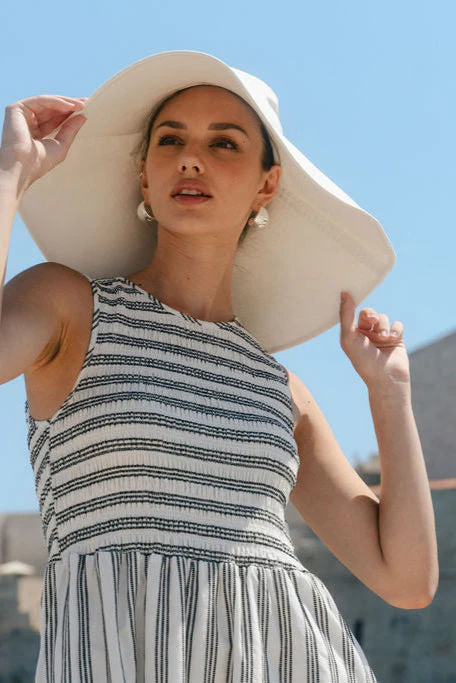 This effortlessly cool stripe dress from RE:UNION Label brings laid-back charm with just the right amount of polish. The shirred bodice adds subtle texture, while the sleeveless cut and crew neckline keep things feeling clean and refined. It’s the kind of dress you’ll throw on and instantly feel put-together.