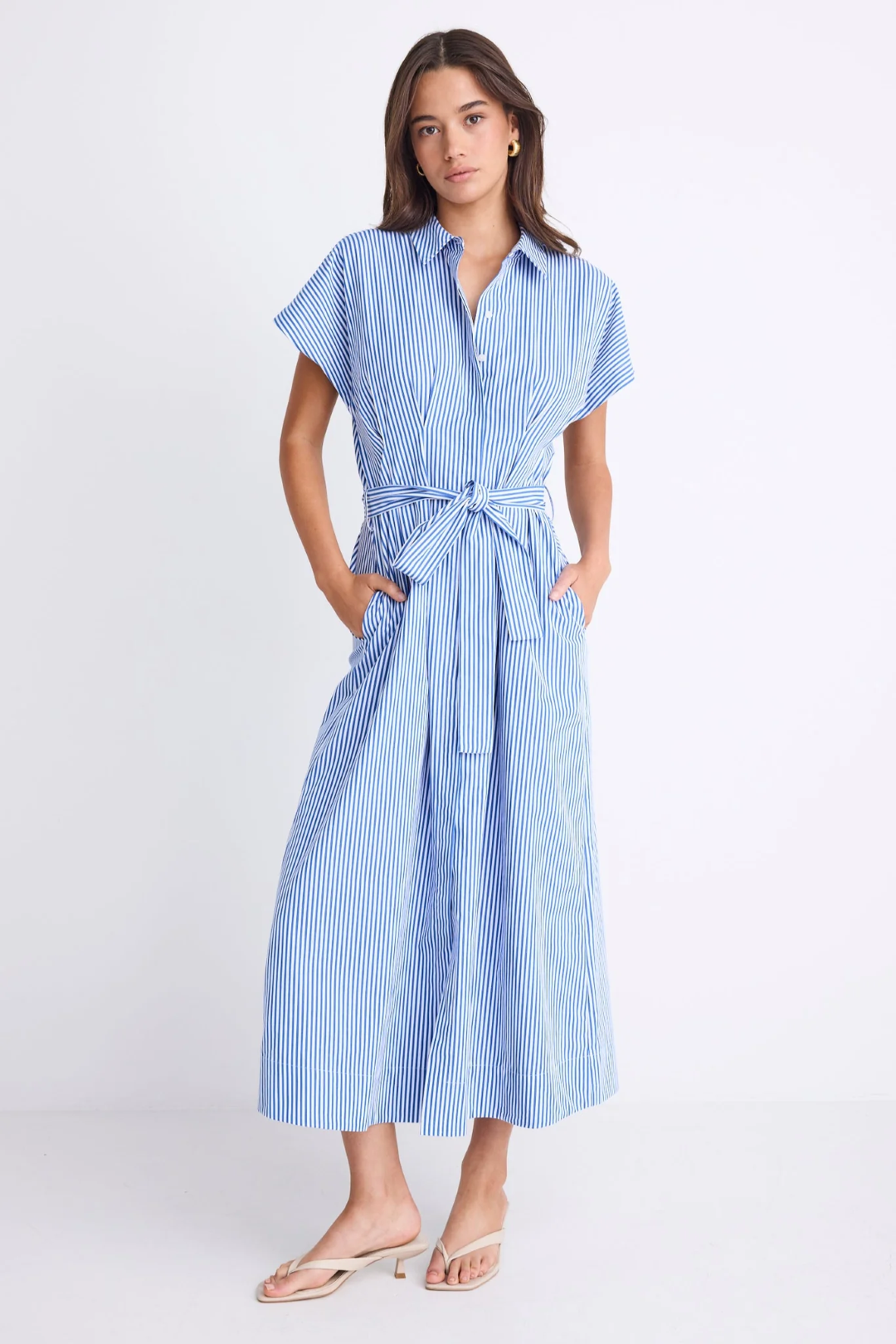 Crisp, clean, and endlessly wearable, the Camden Shirt Dress is a modern twist on a classic. Designed in fresh bright blue stripes, it features a relaxed shirt-style top with a button front and a tie belt to cinch at the waist. The pleated skirt adds movement and polish, while the 100% cotton natural fibre keeps it breathable and easy to wear.