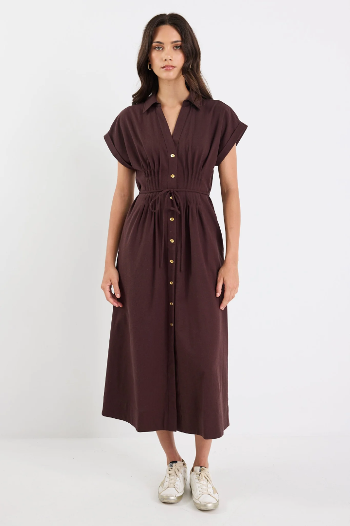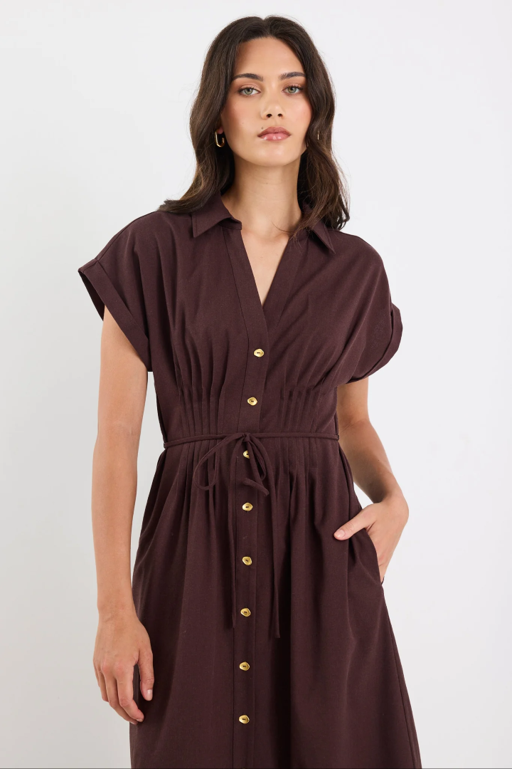 Effortless, refined, and ready for anything, the Carriage shirt dress brings timeless charm with a relaxed twist. The pintuck detailing and gold-tone buttons add polish, while the sleeveless cut and drawstring waist keep things easy and wearable. Perfect for styling up or down.