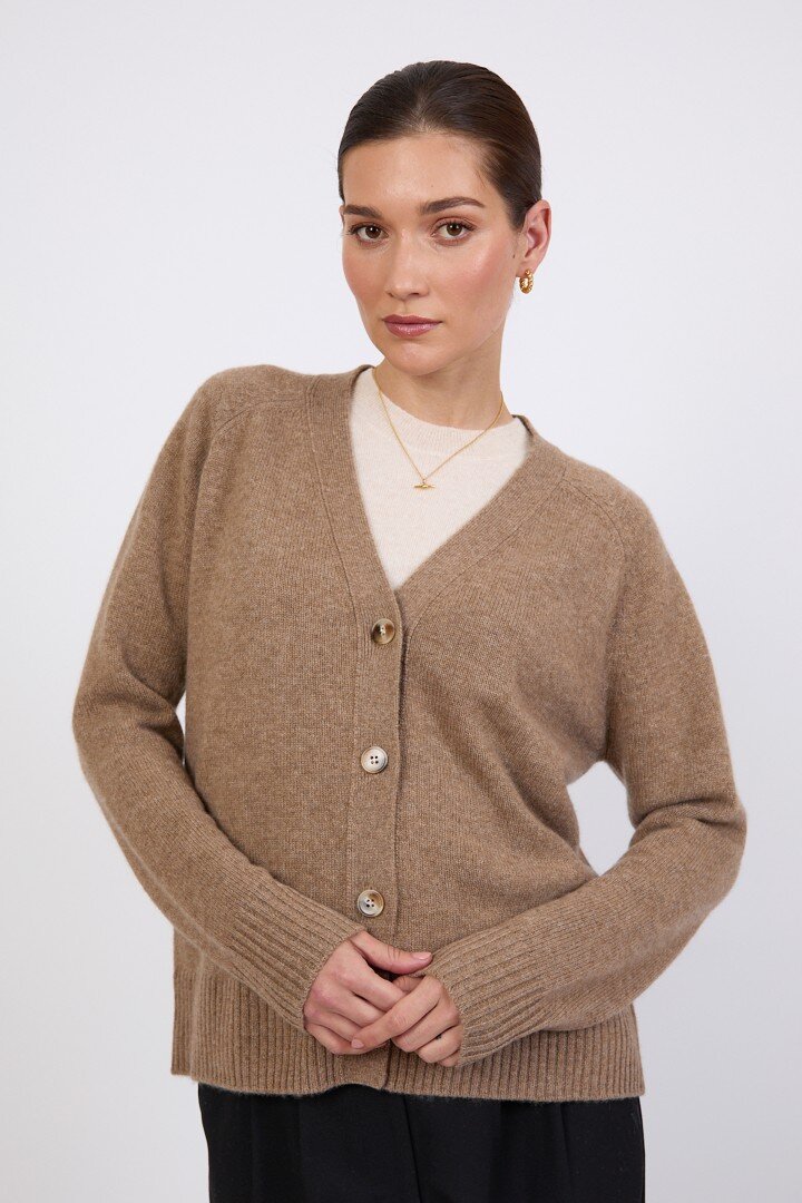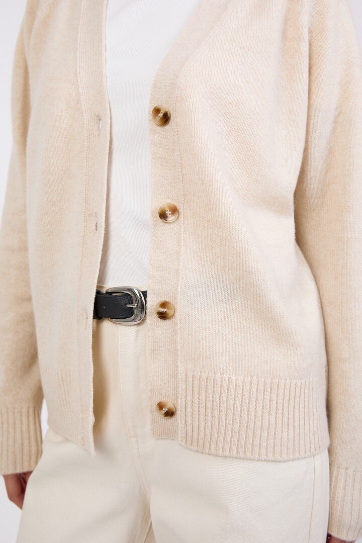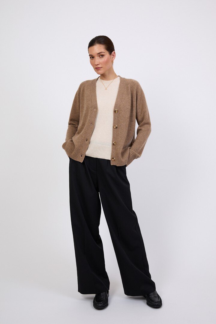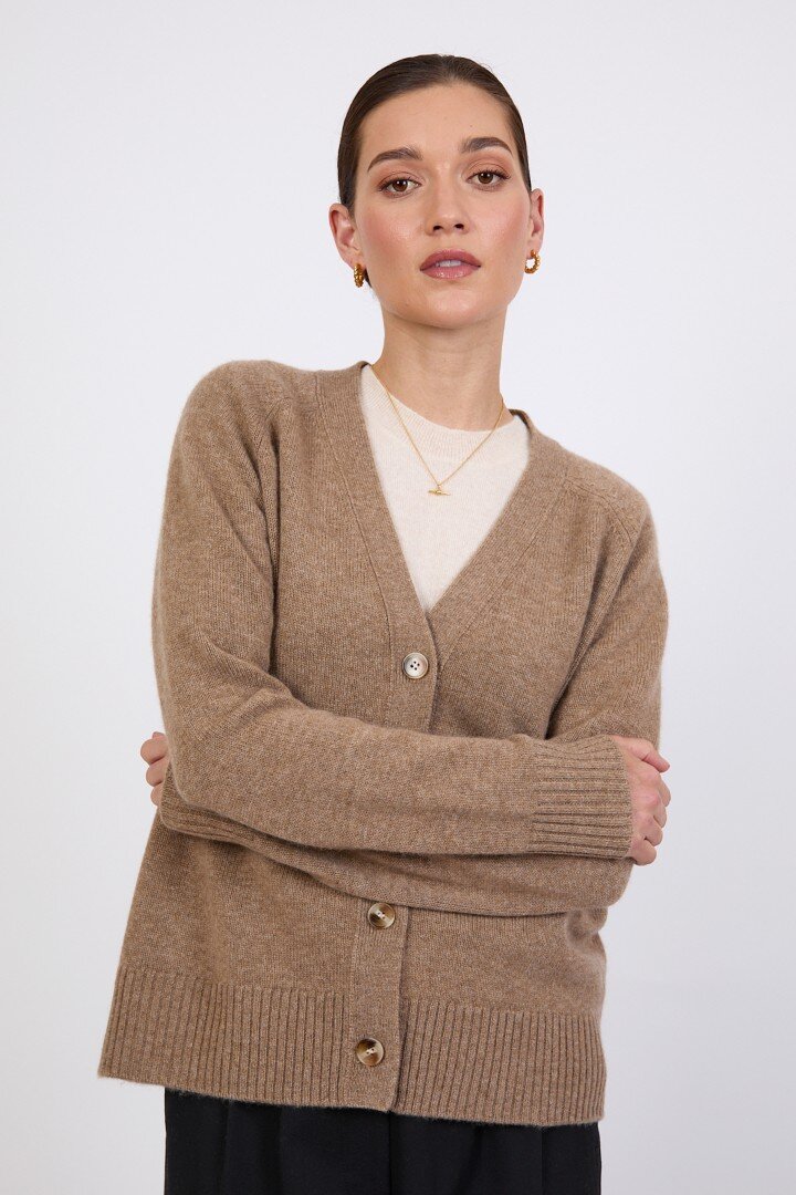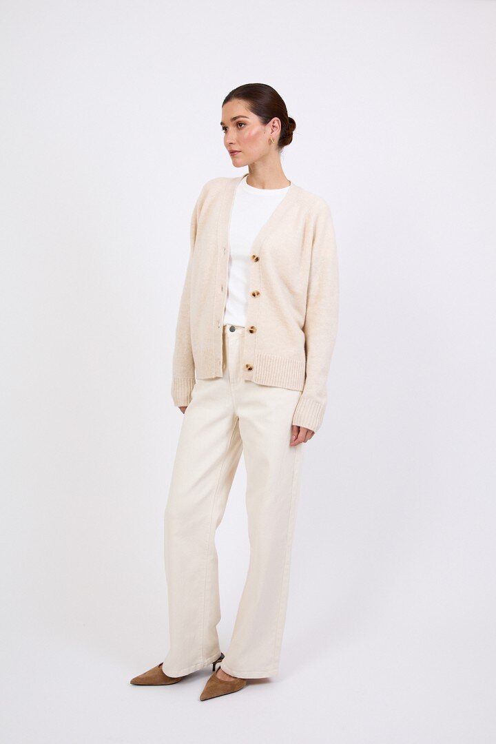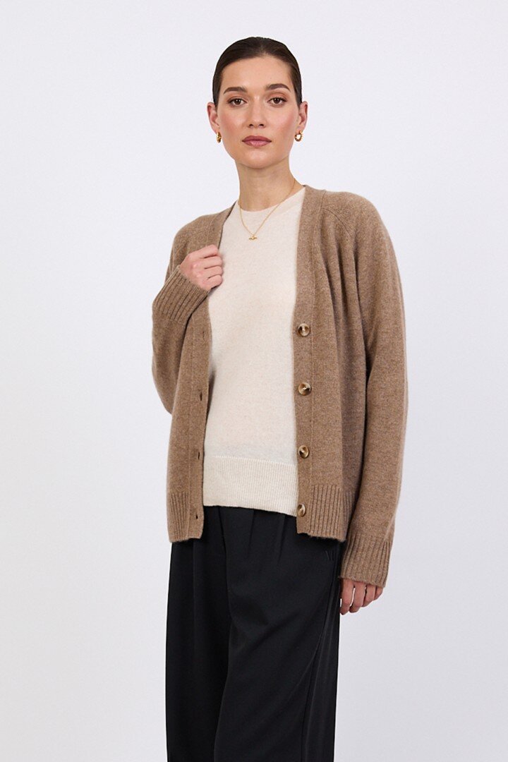 Wrapped in the softness of pure cashmere, this season’s V Neck Cardigan is designed to feel as luxurious as it looks. Cut in a relaxed, slightly boxy silhouette with soft dropped shoulders, it features a flattering V neckline, wide placket and tonal tort buttons for a clean, elevated finish.Crafted in a mid-heavy weight 7 gauge cashmere knit, it offers warmth without heaviness, making it the perfect piece to carry you through the seasons. Easy to wear yet considered in every detail, it can be styled buttoned up for a more polished feel or worn open over the matching cashmere tee for a relaxed, layered look. Also available in Shadow and Shell