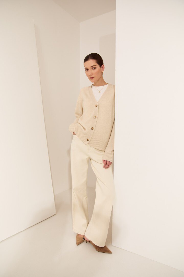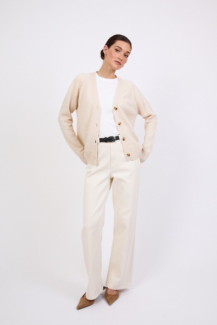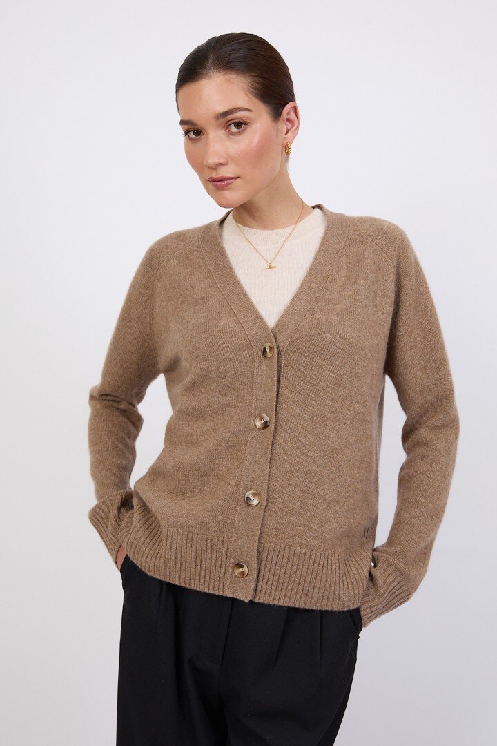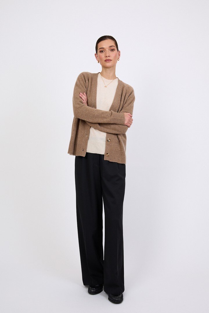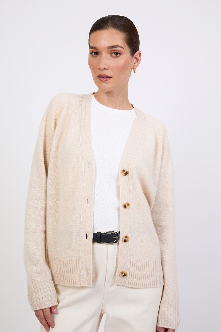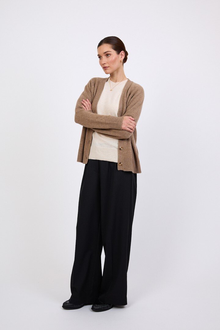 Wrapped in the softness of pure cashmere, this season’s V Neck Cardigan is designed to feel as luxurious as it looks. Cut in a relaxed, slightly boxy silhouette with soft dropped shoulders, it features a flattering V neckline, wide placket and tonal tort buttons for a clean, elevated finish.Crafted in a mid-heavy weight 7 gauge cashmere knit, it offers warmth without heaviness, making it the perfect piece to carry you through the seasons. Easy to wear yet considered in every detail, it can be styled buttoned up for a more polished feel or worn open over the matching cashmere tee for a relaxed, layered look. Also available in Shadow and Shell