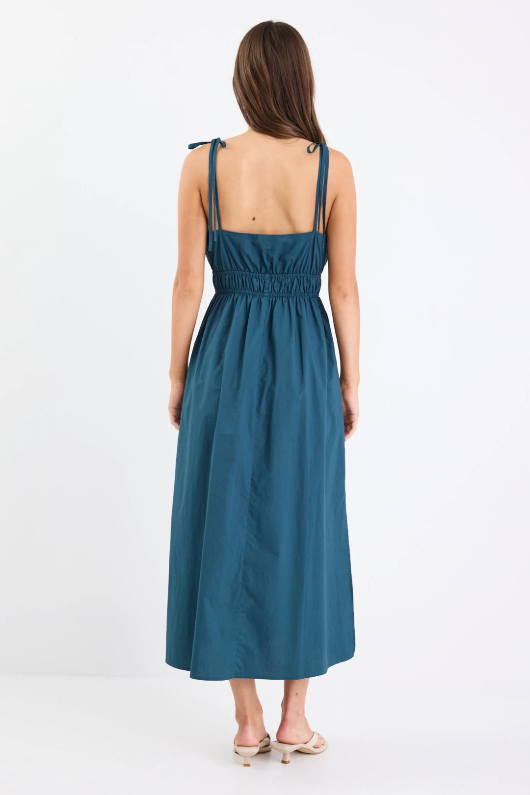 Chic and effortless, the Cast Midi Dress is the definition of easy elegance. With its rich petrol blue tone and strappy silhouette, it’s designed to flatter with subtle gathering through the bust and waist. The tie detail adds a delicate finish, while the natural cotton fabric keeps it breathable and light to wear.