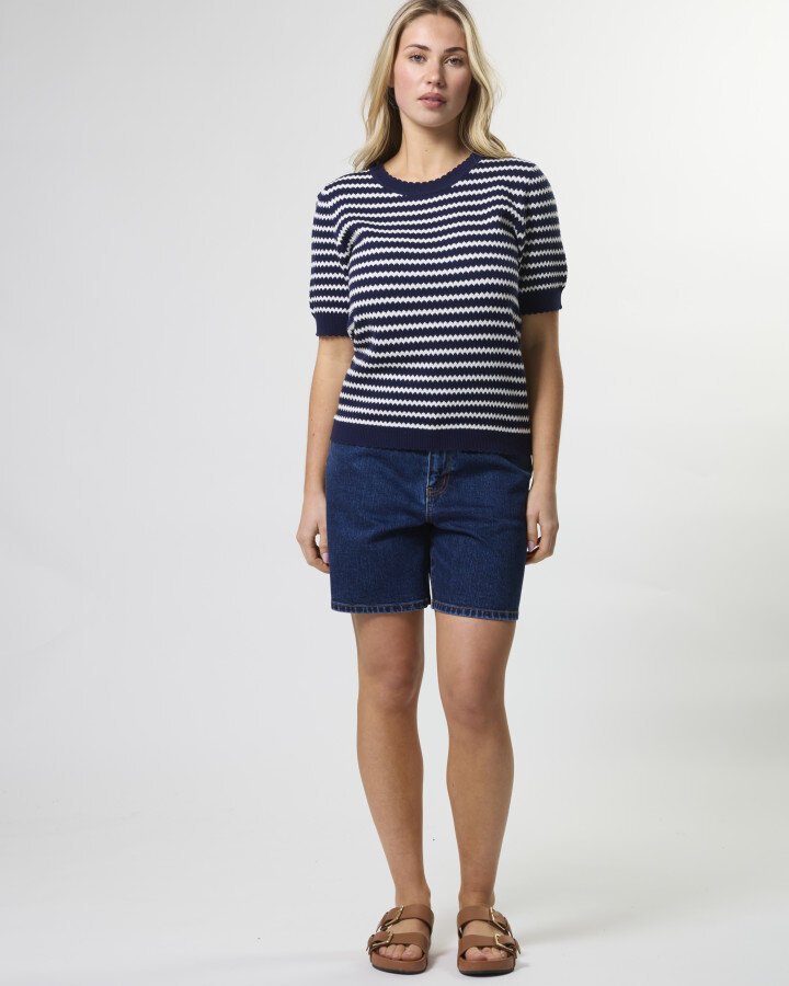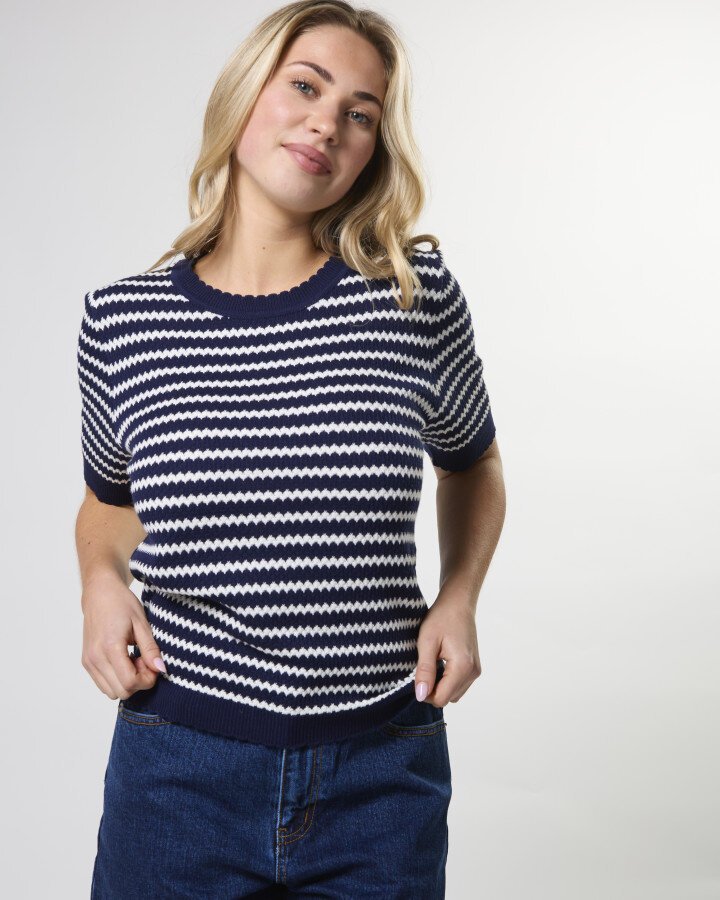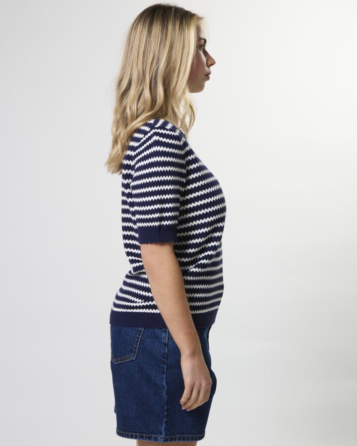 Crew knit knit top with curved stripe design and scalloped edges on neckline, cuffs and hem.