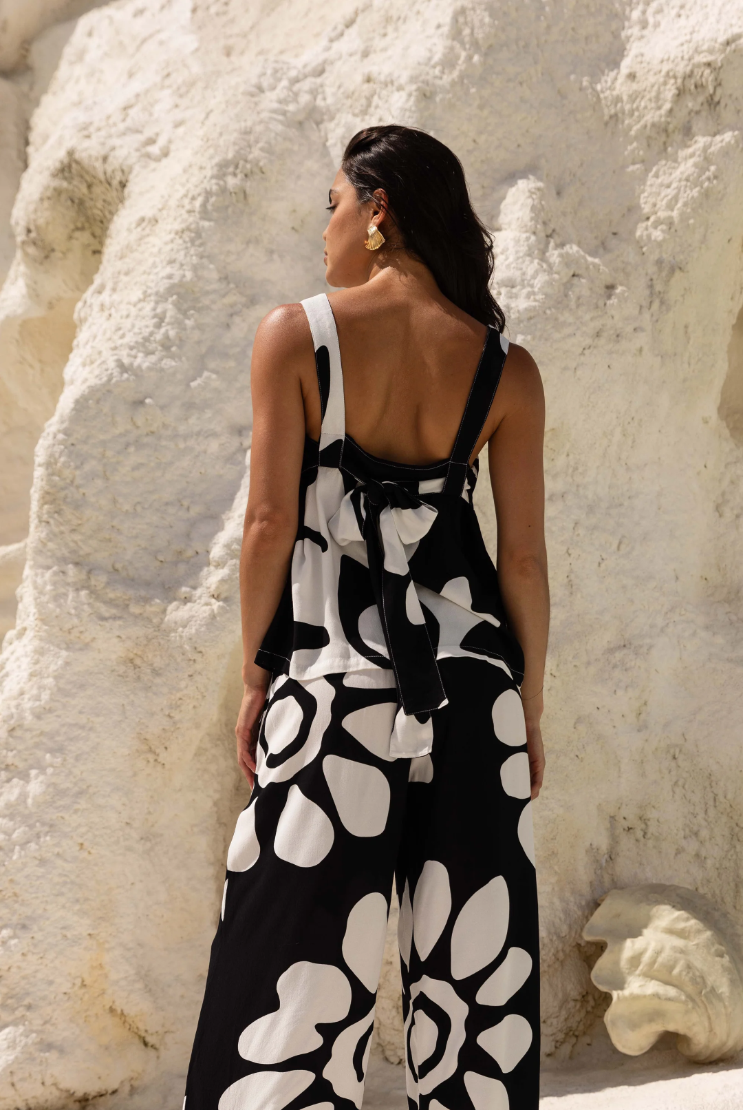 The Cinta Top is an easy standout. Crafted from lightweight viscose in our exclusive Black/Ivory Flower Print, it features a square neckline, wide shoulder straps, and a statement tie-back closure. The relaxed fit and fluid drape make this top an effortless option for warm days and relaxed nights.