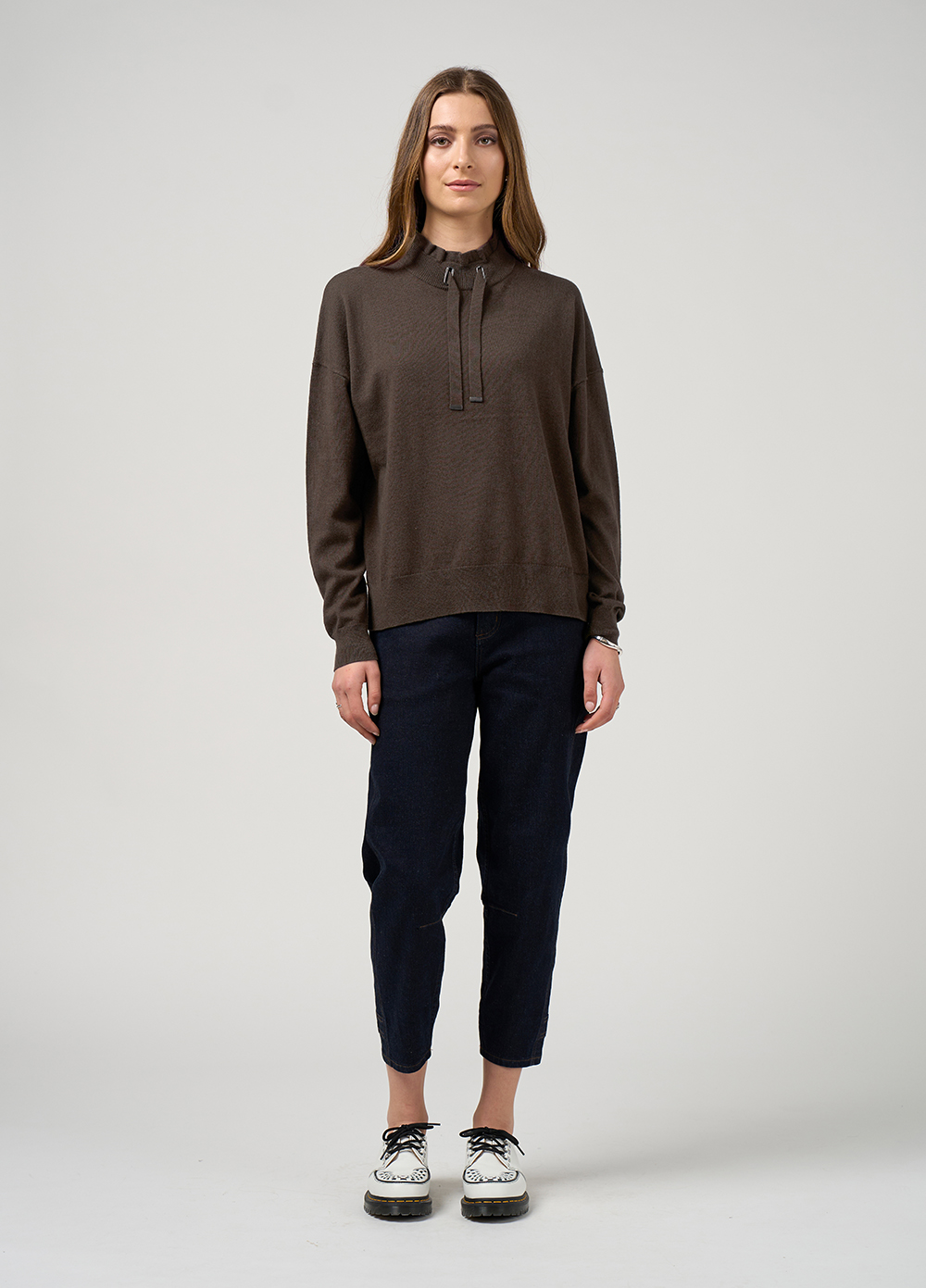 High neck sweater in a soft cotton-cashmere, with a dropped shoulder and a drawstring collar, Featuring ribbing detail around neckline, cuffs and hem.