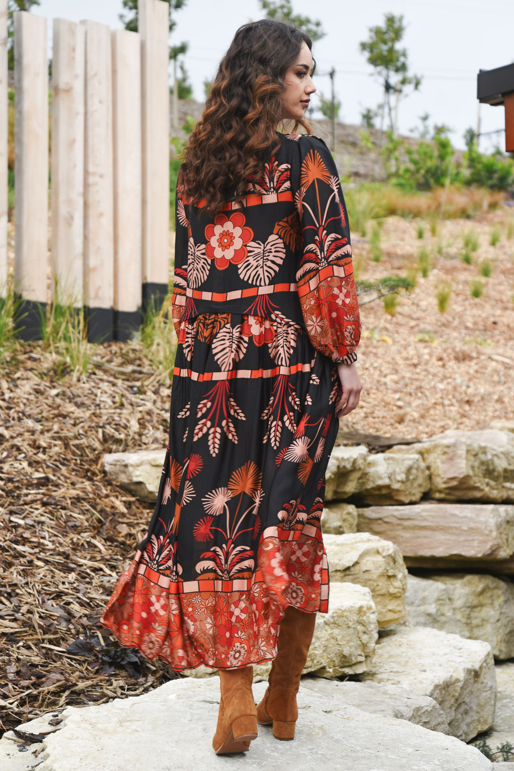 Steeped in the black-based autumnal florals of our 'Brown of Thorns' viscose satin, the 'Glamour to Go' dress brings a quiet drama to everyday dressing. A button-through front and softly curved waist create a flattering, contoured silhouette, while the gathered skirt and voluminous balloon sleeves add a sense of movement and ease. It’s a piece that delivers instant elegance, no effort required.