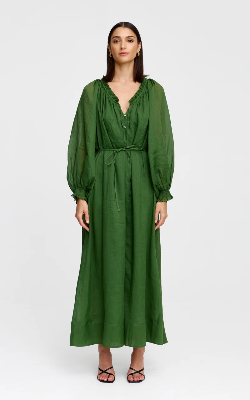 The Claudia Dress is a firm favourite, a relaxed shirtdress shape. Featuring voluminous sleeves with ruched cuffs, gathered frill detail along the neckline and buttons that run the length of the dress.