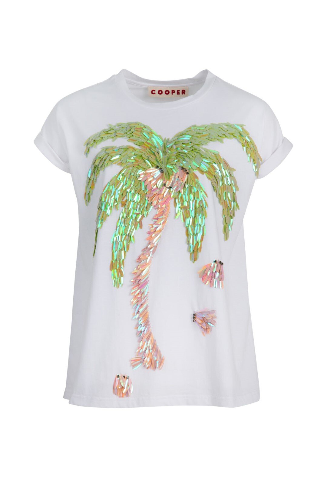 Adorned in eye-catching lustrous sequin and boasting summer with the palm tree motif, the ‘Crown Jewels’ t-shirt is the perfect addition to dress up a casual outfit with ease. Crafted in the ‘Close Knit’ fabrication, this standard fit tee features fixed rolled cuffs, and is detailed with gems amongst the sequins. Style from day to night, the bold print elevates your look with ease.