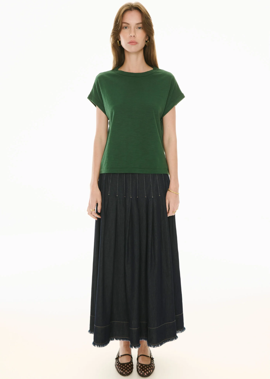 The Doyle Denim Skirt features pleated detailing over the hips for an elevated take on a wardrobe classic.