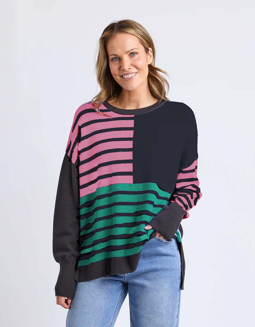 Elevate your everyday style with the Effie Mixed Knit, where thoughtful design meets versatile appeal. The front and one sleeve showcase a striking pink,turquoise and navy stripe pattern that adds visual interest, while the plain back and contrasting sleeve keep things balanced and sophisticated. Practical side splits offer freedom of movement and a modern silhouette that works beautifully layered or worn solo.