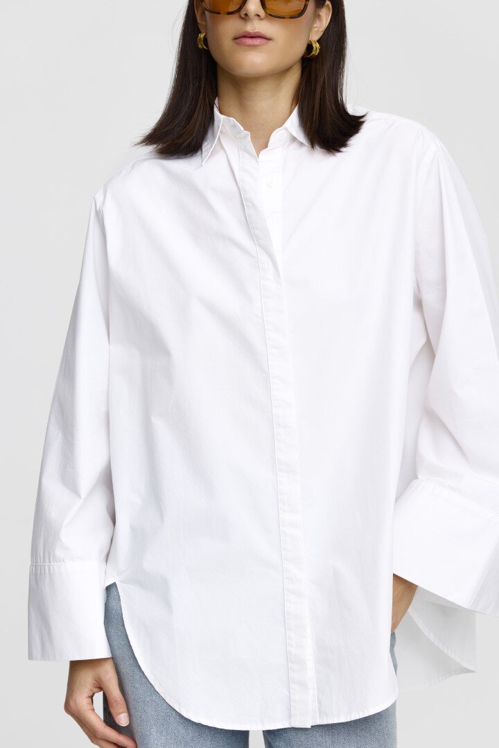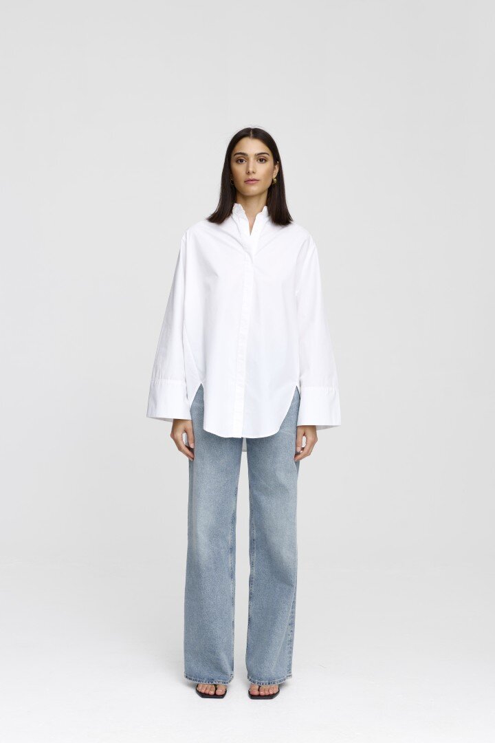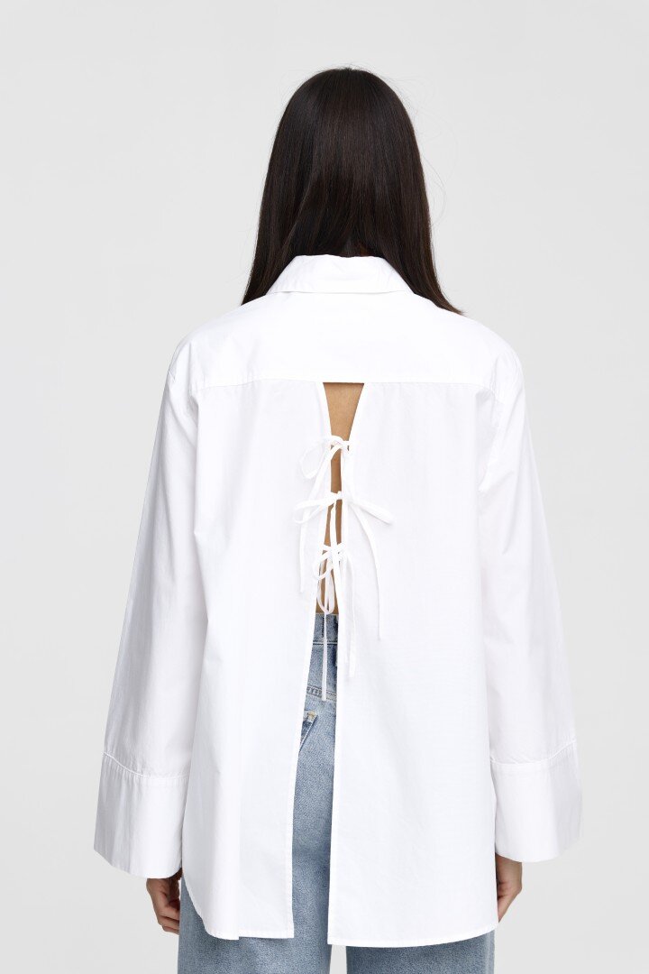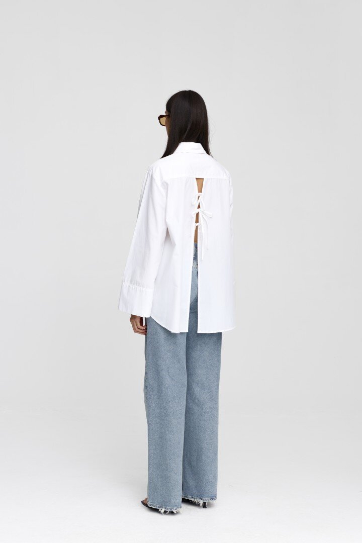The Elodie Shirt is a fun-twist on the classic Kinney shirt shape. Featuring a statement open-back design held together by a row of adjustable ties and wide sleeves with slits at the cuffs.