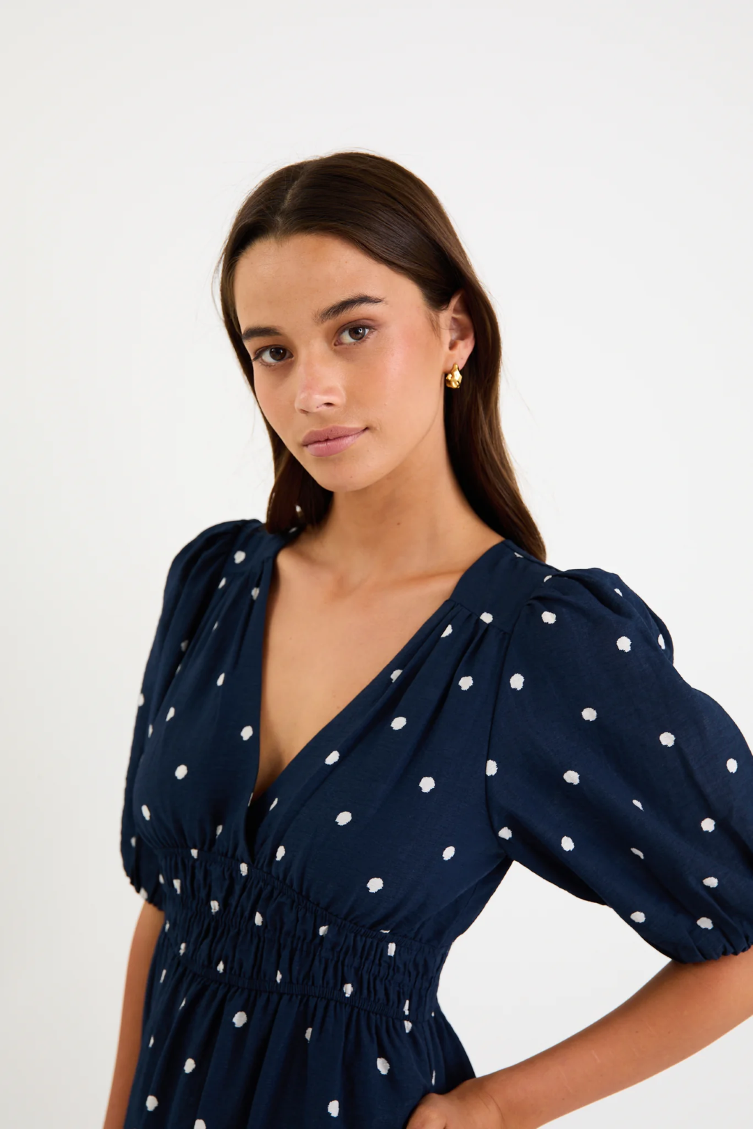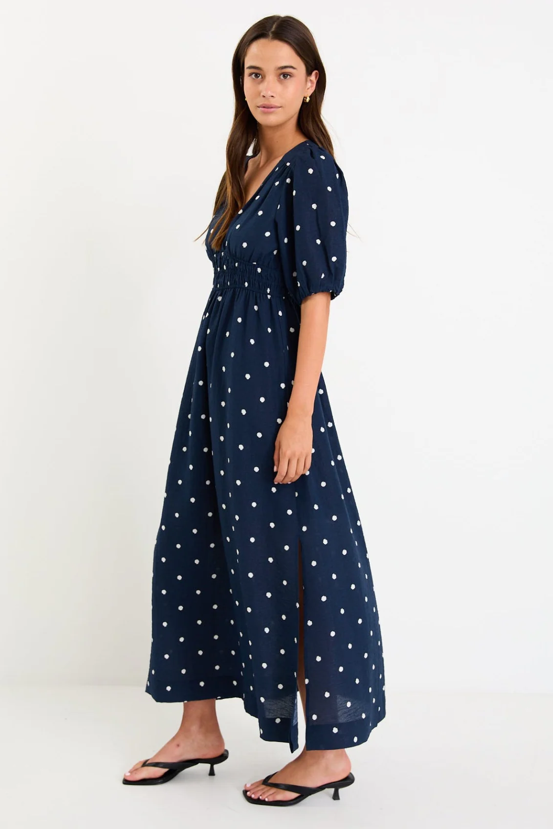 A timeless polka dot moment you can wear from slow weekends to long lunches. The Eloquent Dress features a soft V neckline, flutter style short sleeves, and a gently elasticated waist that shapes without feeling snug. The flowing maxi skirt adds easy movement while the linen blend keeps things light and breathable.