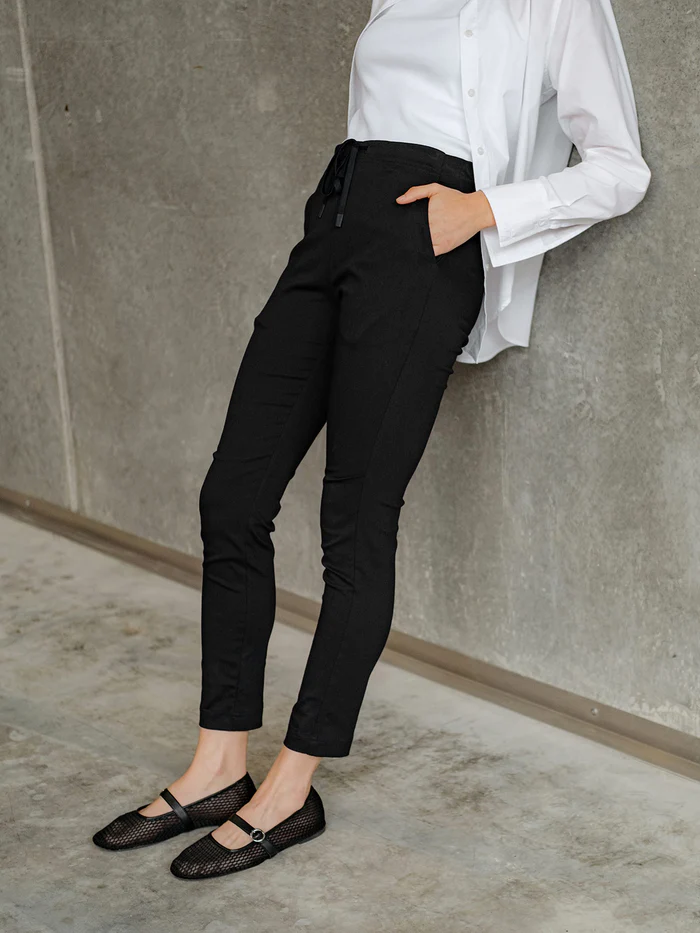 Our popular Emily Jogger has a relaxed fit, 7/8 leg and tapered ankle. The signature semi drop crotch, darted hip pockets and knee detail gives this little lady a modern vibe. Made in our original Torpedo cloth; gutsy, reliable, comfortable and flattering.