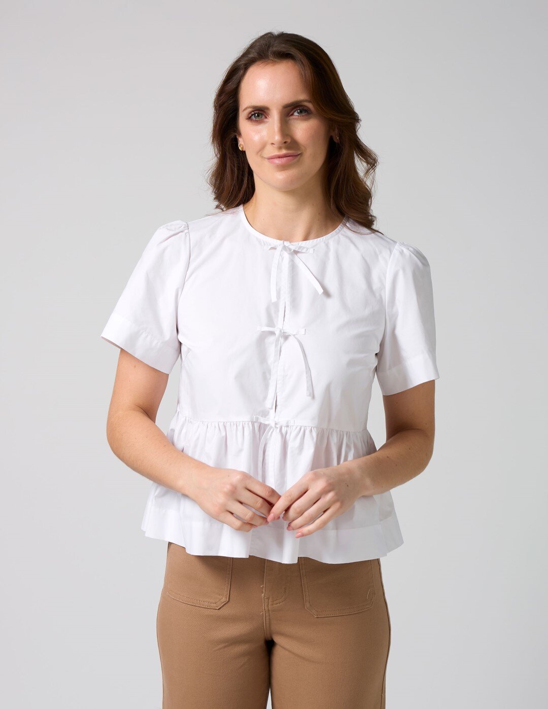 Crew neck peplem blouse with gathered shoulder detail and self fabric bow ties down centre front. Hook and eye fastenings under the bows