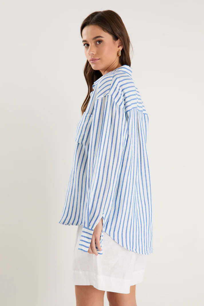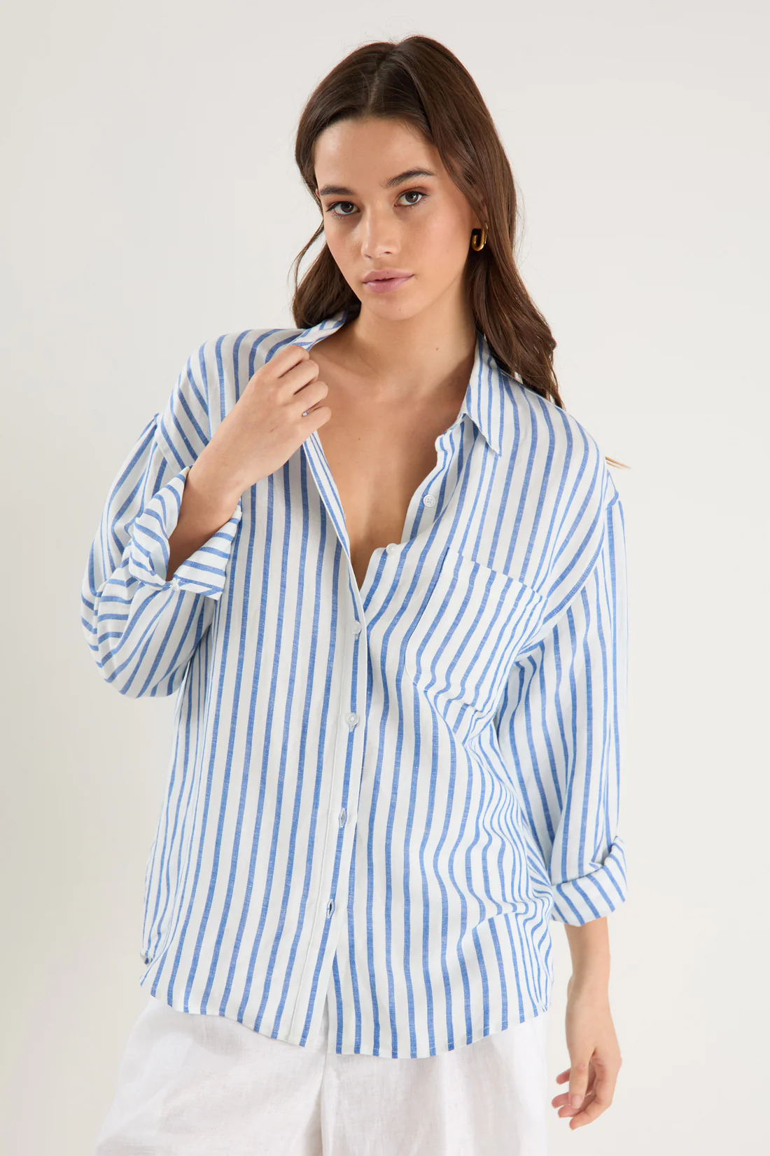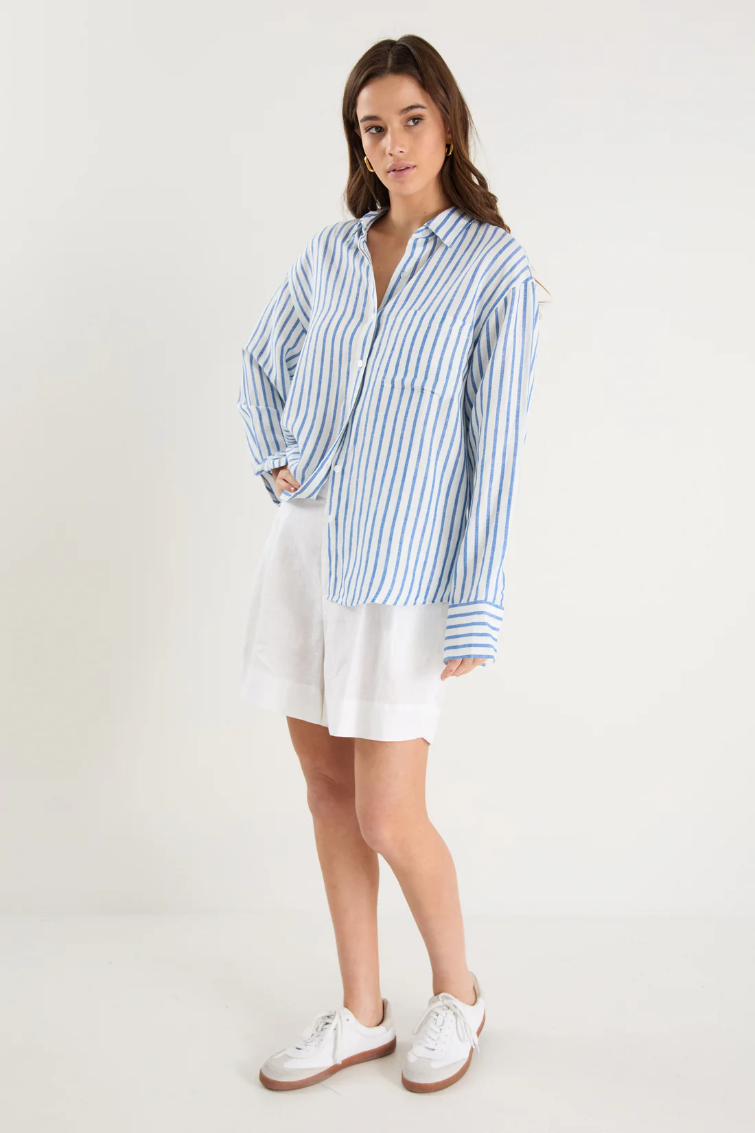 An easy classic with a fresh twist, the Exalted shirt is all about relaxed polish. Designed with an oversized fit and timeless vertical stripes, it drapes effortlessly for that off-duty yet styled vibe. The linen-viscose blend feels breathable and soft, making it perfect for everyday wear that transitions seamlessly between occasions.
