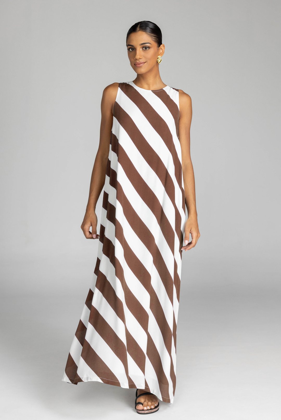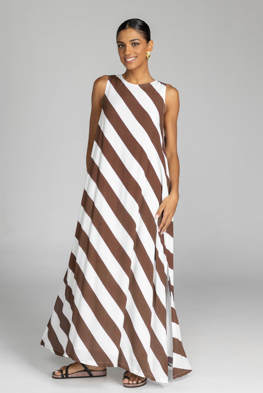 The distinguished Finally Here Dress presents our signature silhouette in premium rayon viscose with an elegant navy and white diagonal stripe pattern, featuring a refined high neckline and sleeveless construction. Thoughtful details include a discreet back keyhole with button closure and precise side splits, creating a versatile silhouette that accommodates diverse body types with sophisticated ease.