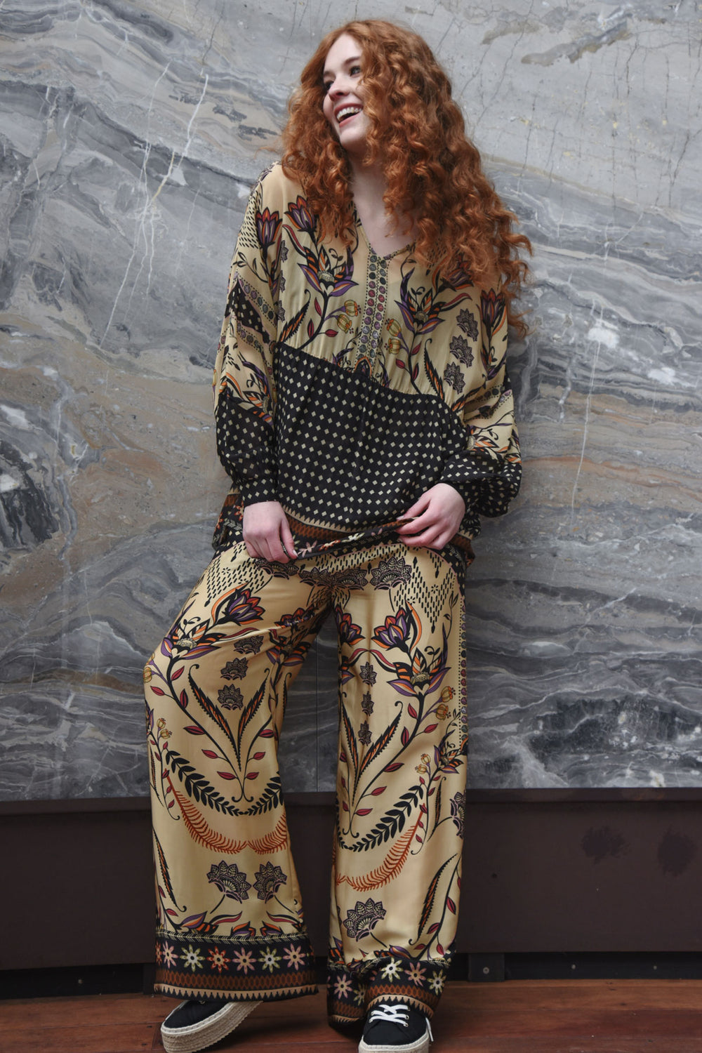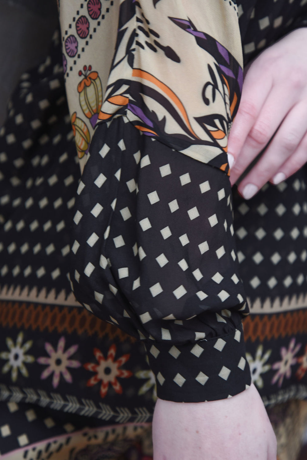 The 'Fired Up Top' in our breezy viscose georgette 'Spotted for the Season' print brings easy elegance to every day. Its V-neckline offers a flattering, feminine line, while the blouson sleeves add soft shape and movement. Finished with a fixed cuff and button fastening for a refined touch, it’s the perfect piece to dress up denim or elevate your favourite tailored looks.