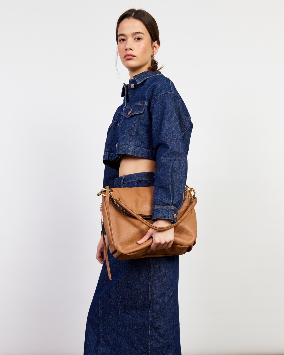 Everyone's favourite oh-so functional Frankie! Constructed in heavy-duty textured leather and pale gold hardware with an up-sized chunky zip. Frankie's functional handle set up means she can propped up on the shoulder or draped cross-body. The perfect partner from Monday to fun-day. Use the pockets-a-plenty to organise your life.