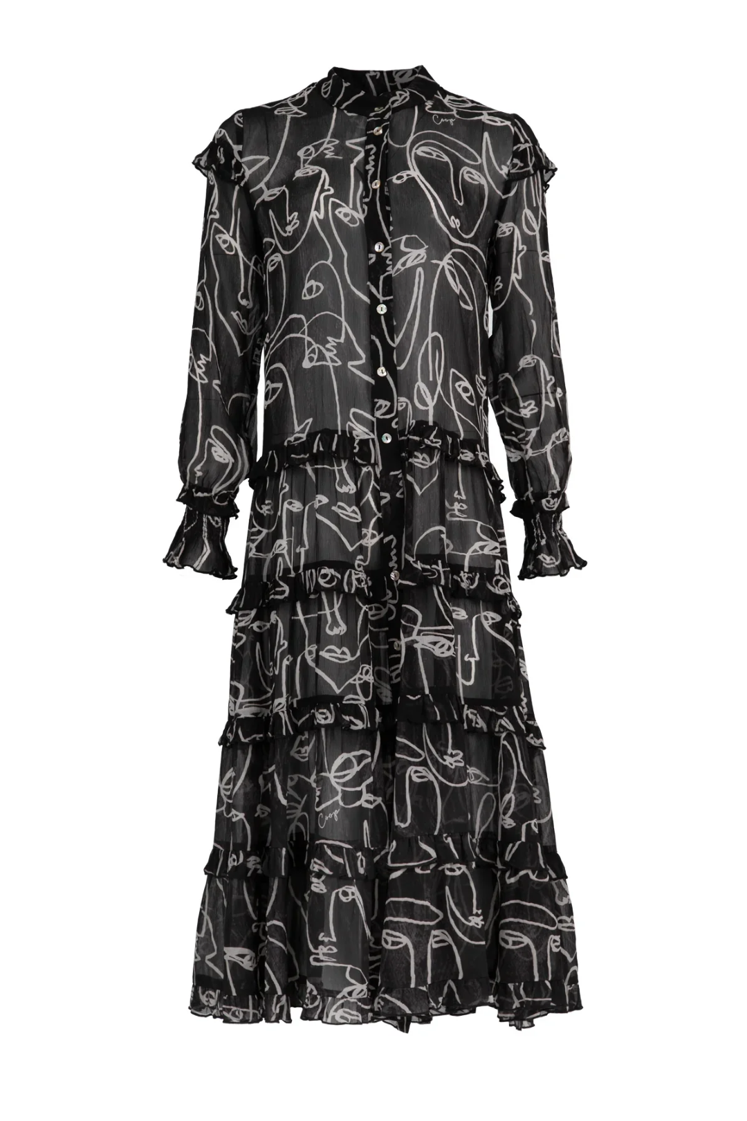 With graphic interest and a fluid fabrication, the ‘Frills & Thrills’ dress is expertly designed to slot into work-wear wardrobes. Crafted in the ‘Face to Face’ viscose yoryu, this lightweight dress sports a button through front, ruffle trim tiers and shirred elastic cuffs.