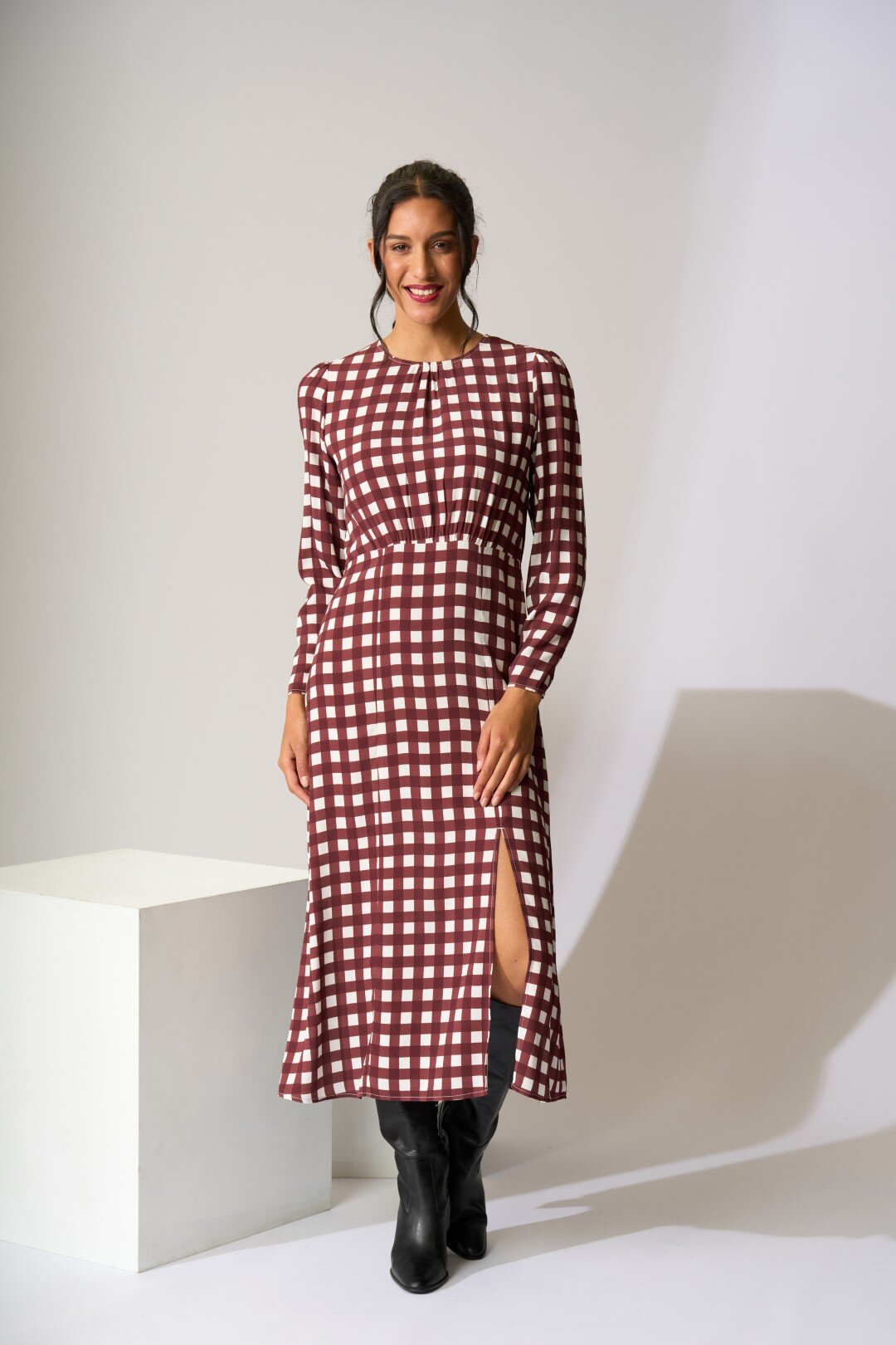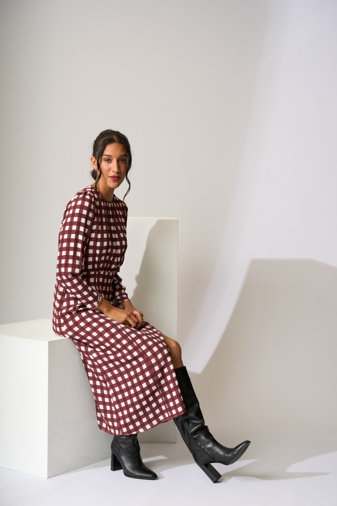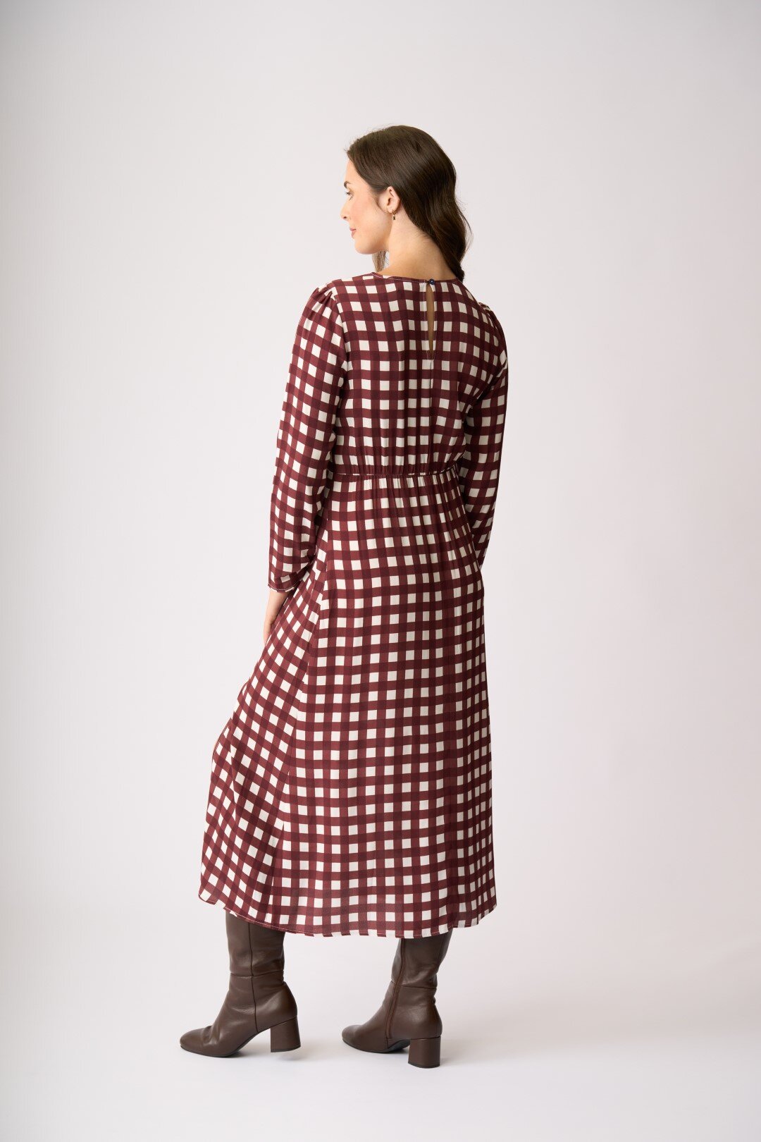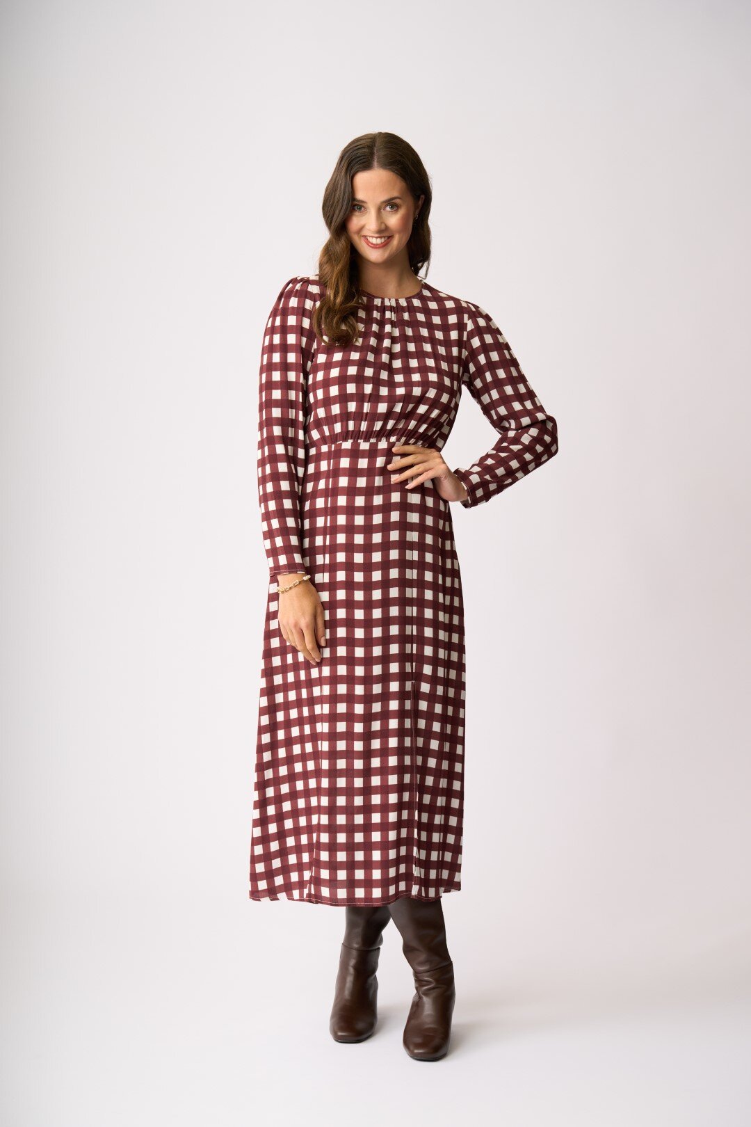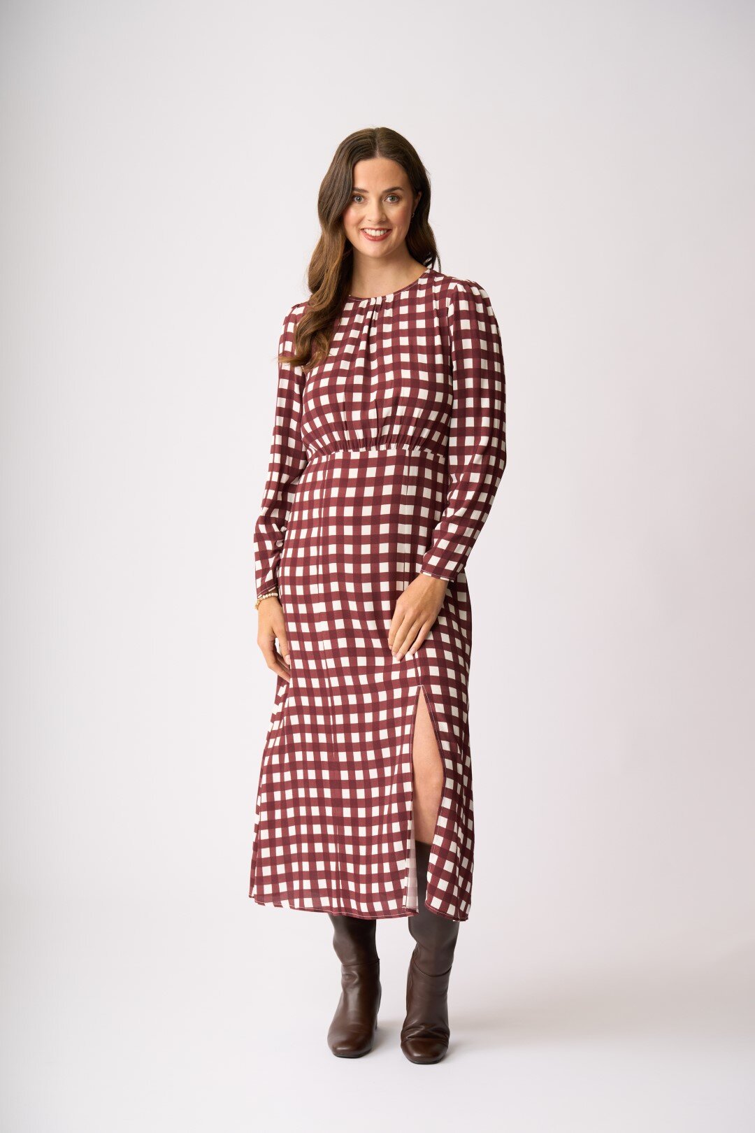 Maxi length dress with gathered detail along the neckline, sleeve seam and at the waist seam.