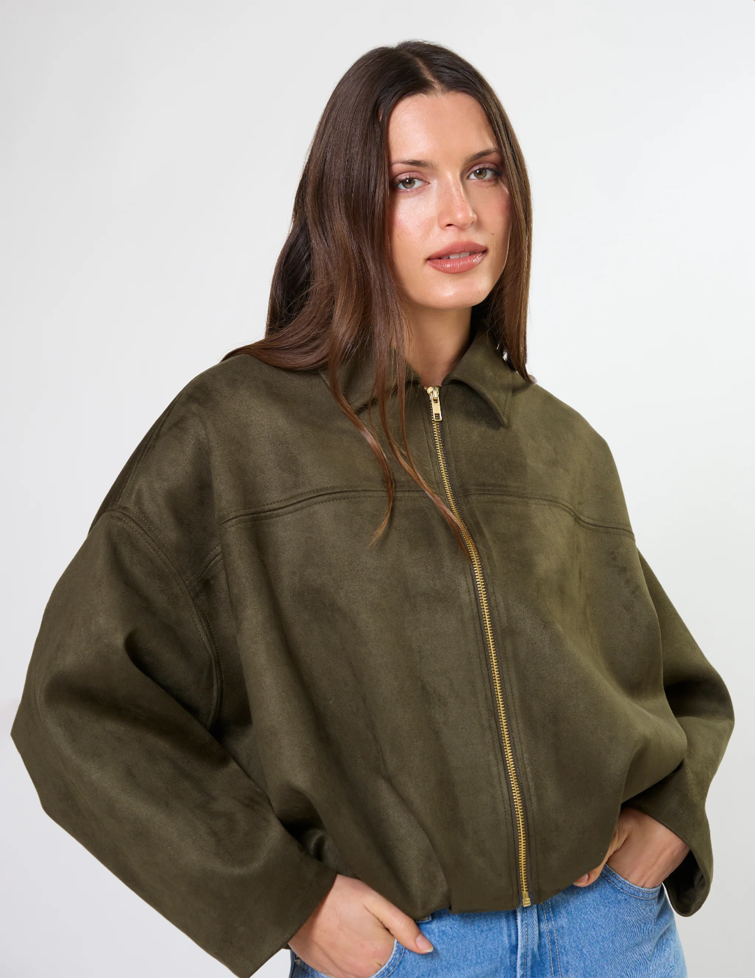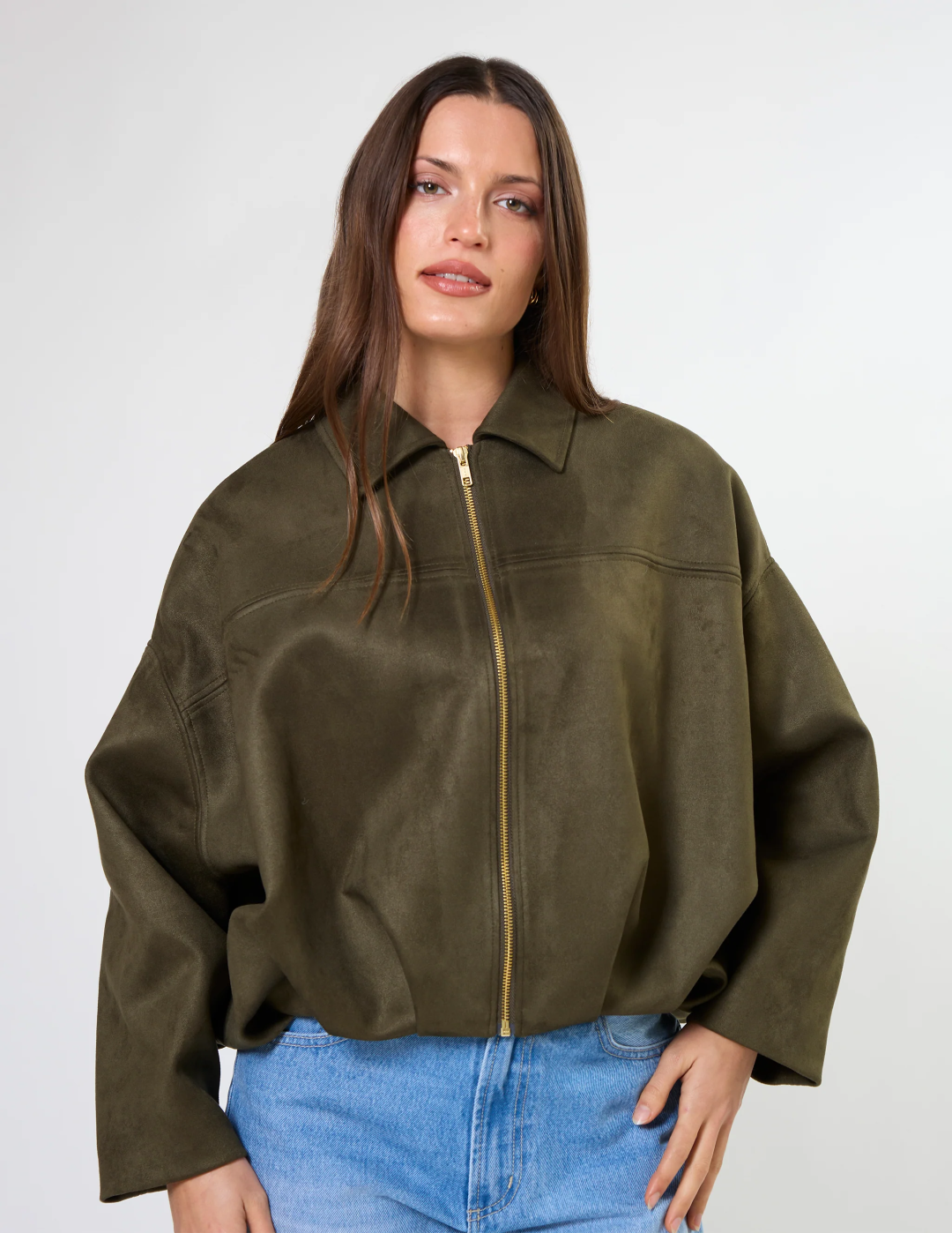 Mock suede relaxed batwing jacket with contrast gold zip front fastening. Fully lined.