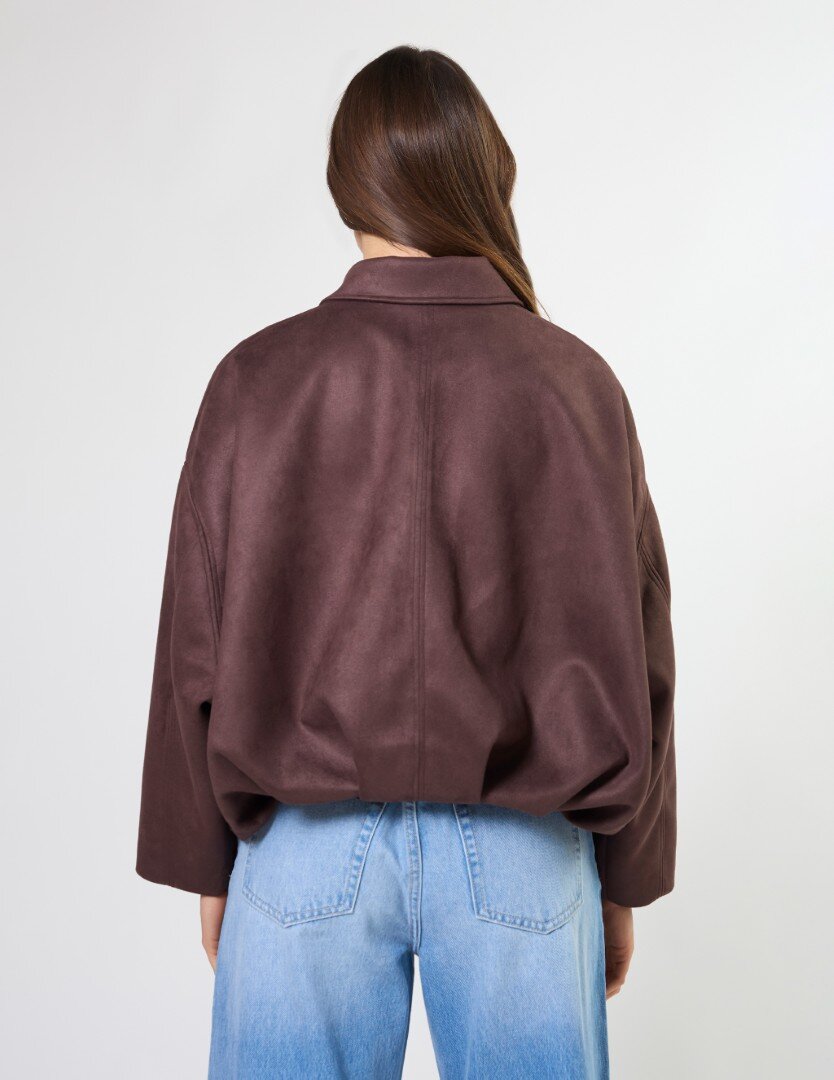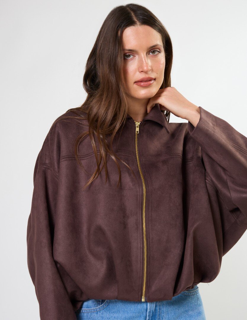 Mock suede relaxed batwing jacket with contrast gold zip front fastening. Fully lined.