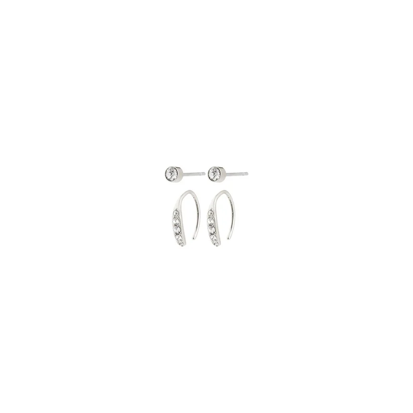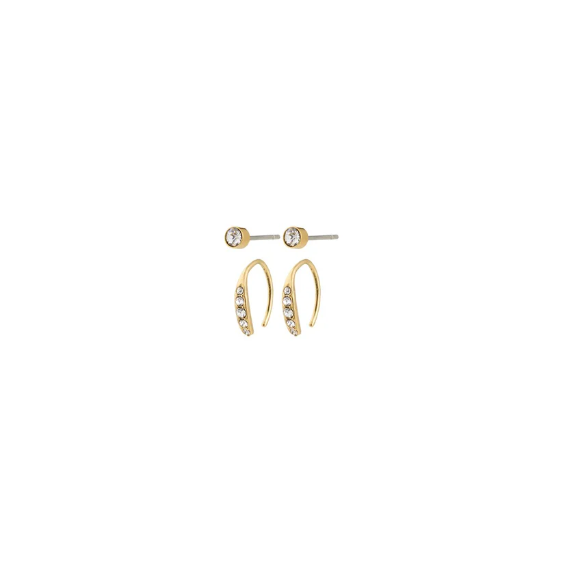 Waterproof Collection - Double up on coolness! With the GIONNI earrings from Pilgrim, you get a 2-in-1 set that offers endless styling options. The small gold- or silver-plated studs with Preciosa crystals are your go-to everyday essentials, while the curved ear hooks add a next-level touch when you want to spice up your look. Mix & match them depending on whether you want to go low-key or all-in for a stacked ear-candy look. Style them with a messy bun or sleek braids for the ultimate fashion-forward vibe. Made from 94% recycled material – fashion with care for the environment.