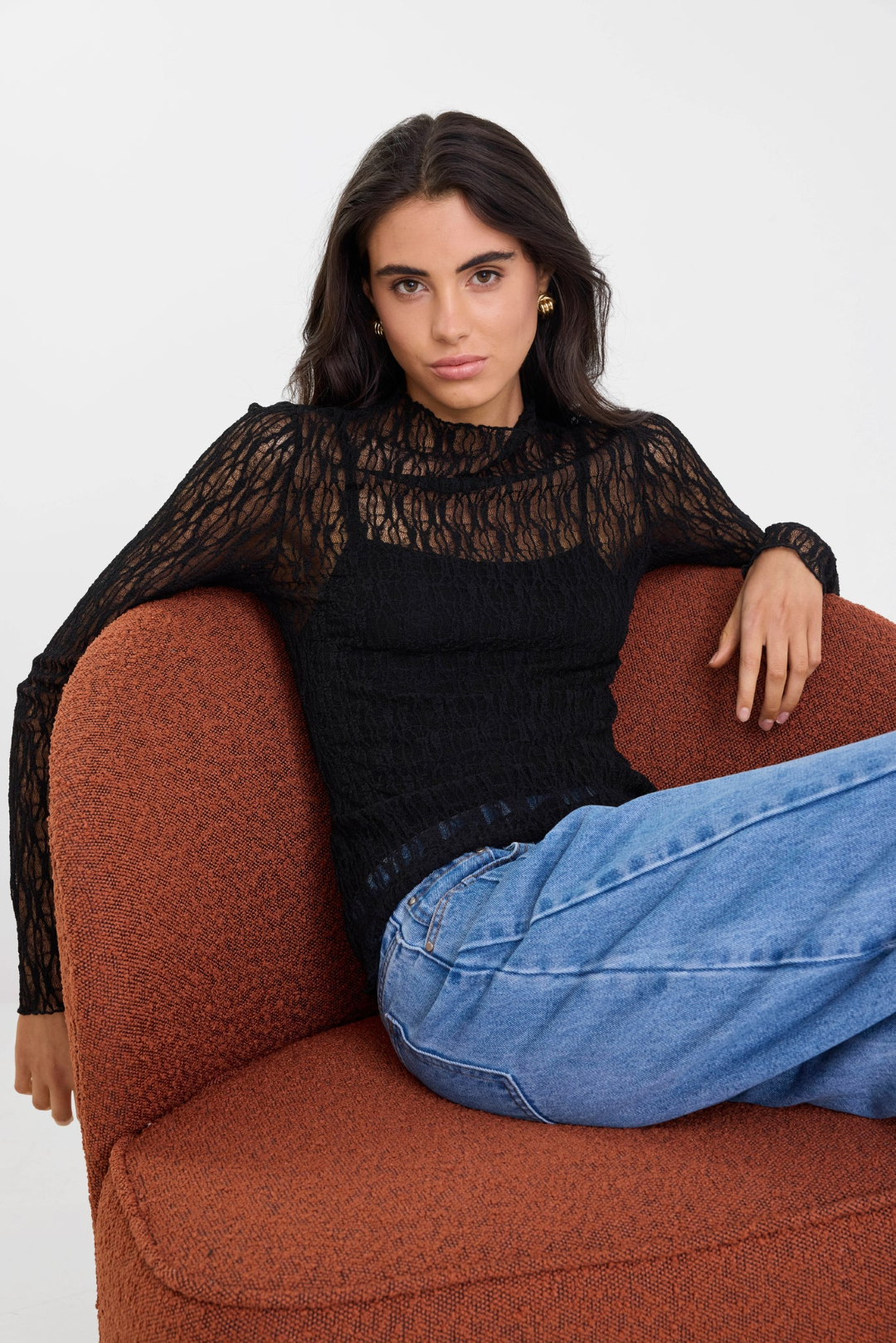 The Giving Black Lace Top is your go to for effortless allure with a refined edge. Crafted in a delicate stretch lace, it hugs the body while the soft inner cami offers coverage, creating a beautifully layered look in one easy piece. The high neckline and long sleeves add elegance, making it perfect for elevating your everyday style.