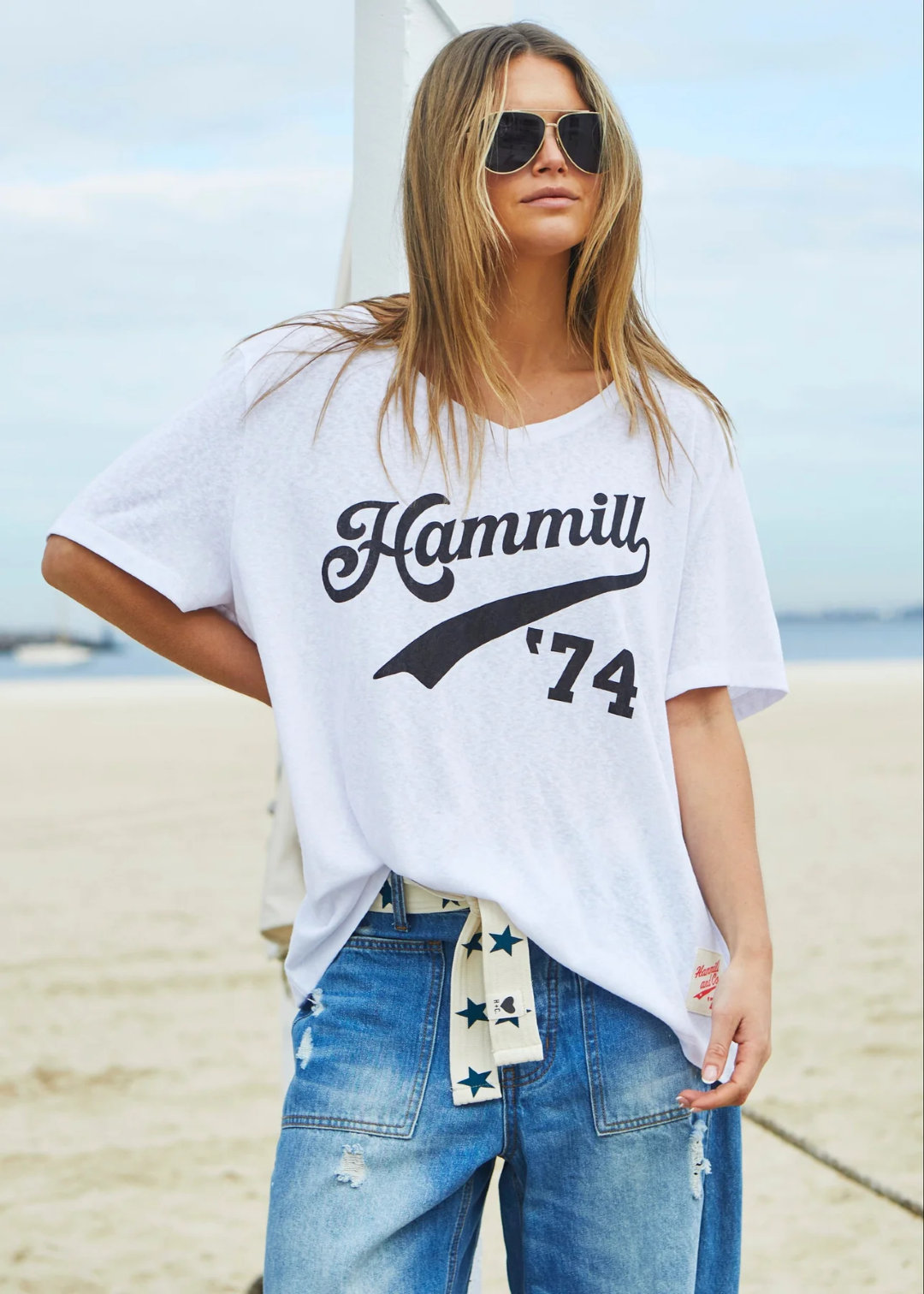 Oversized best selling V neck tee in black with washed white Hammill '74 logo print on the front.