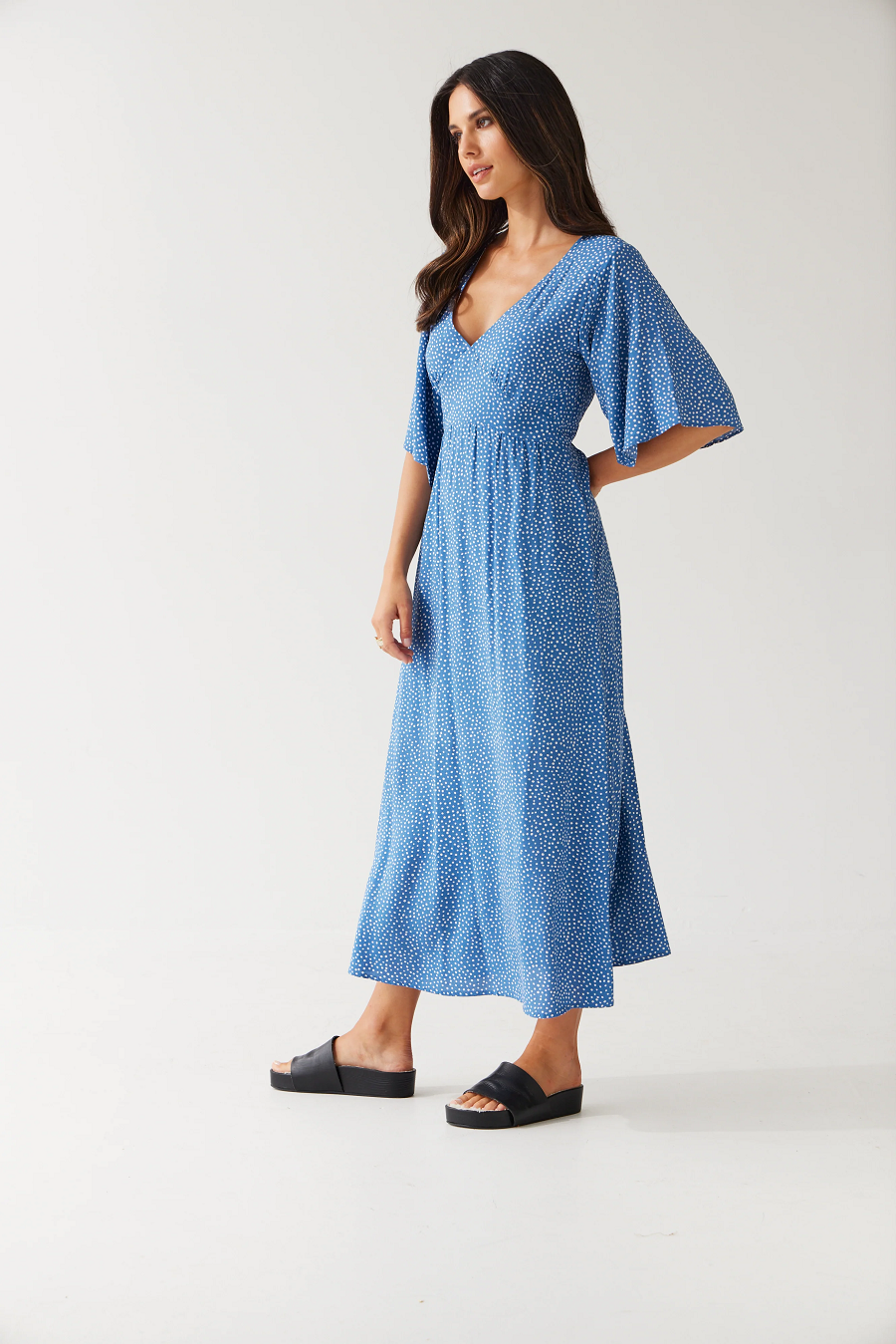 A fantastic new dress shape that ticks all the boxes. Easy midi length, relaxed flowing skirt, flattering fitted bodice, fluted butterfly sleeves, and hidden side pockets, all with a plunging deep v neck to bring her to life.