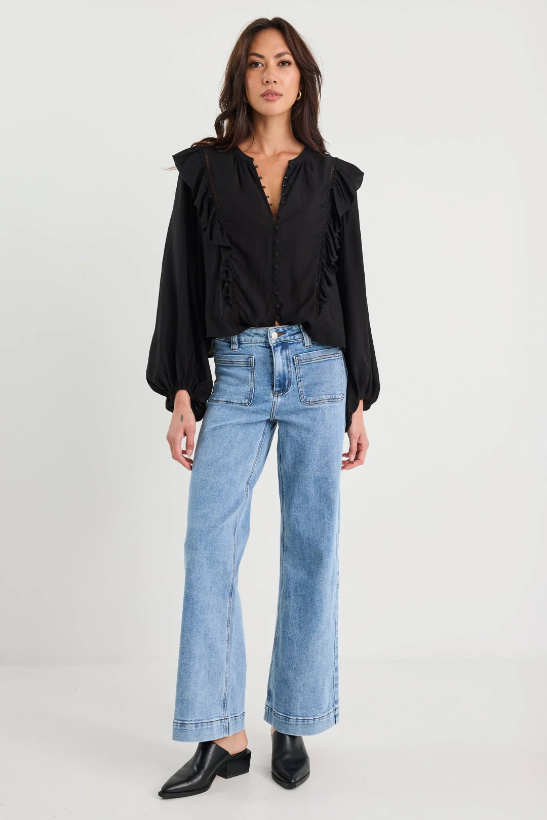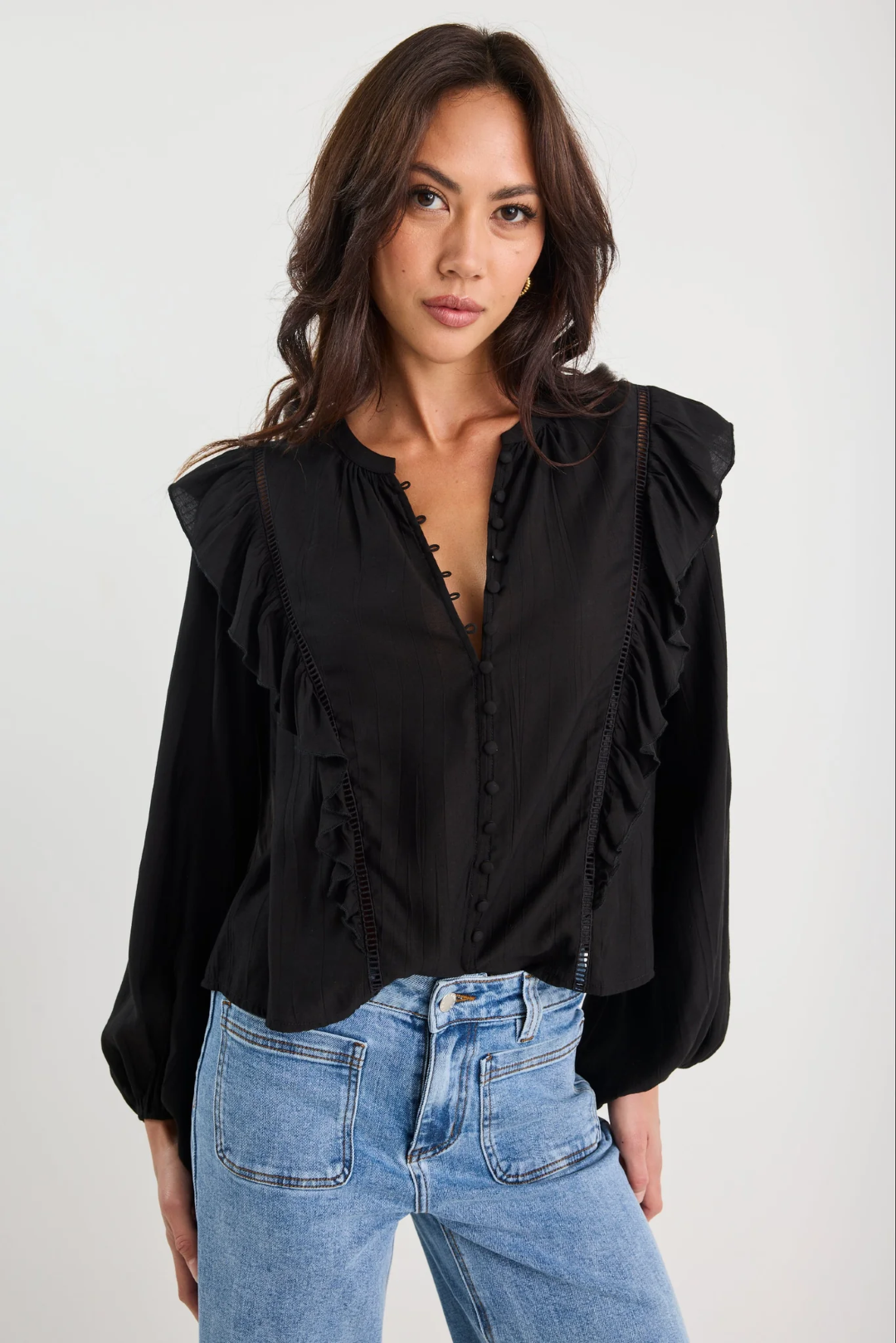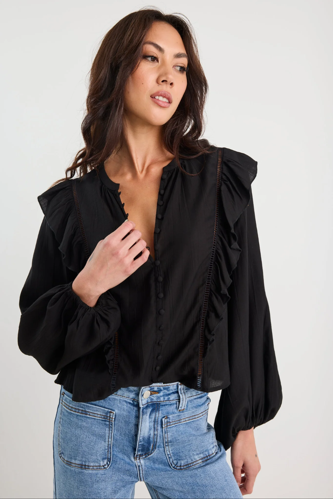 Romantic and subtly edgy, this sheer black blouse features frill detailing and a soft textured finish. The fabric drapes beautifully with covered buttons and a flattering silhouette.