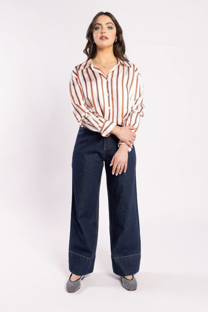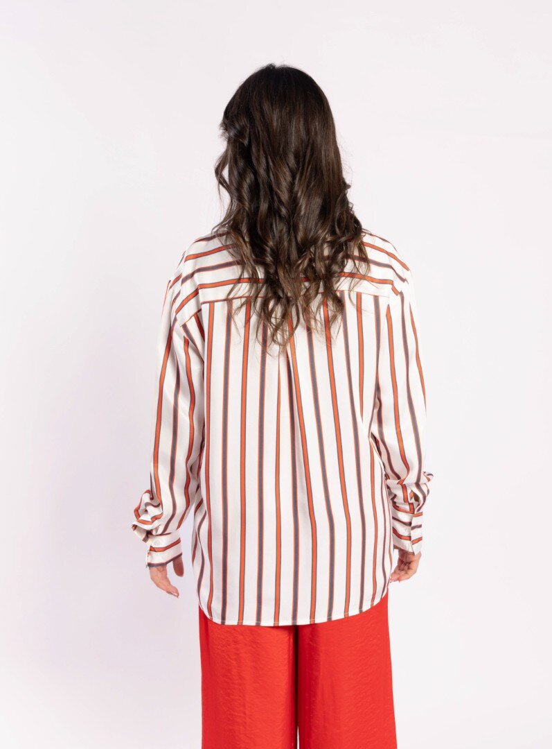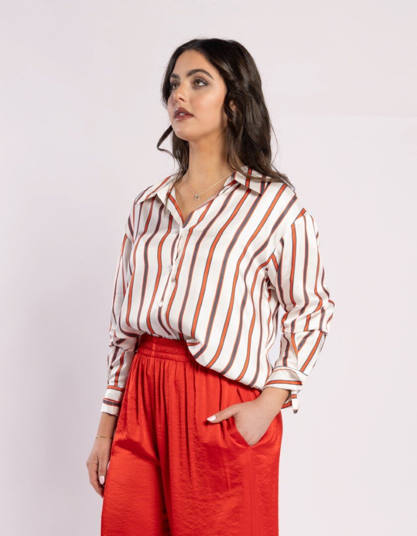 A wardrobe staple is the simply stunning "Its Her Shirt Open Neck Collared Button Front Shirt." This shirt features a curved hem and an oversized cuff that can be folded back and a relaxed . The Stripe is in a Red and Ink, adding a touch of elegance to any outfit.