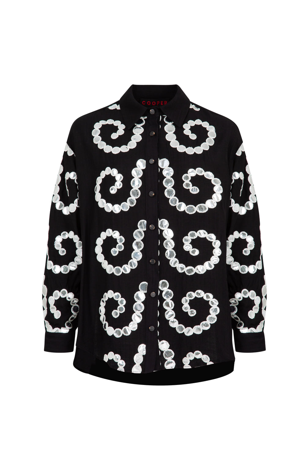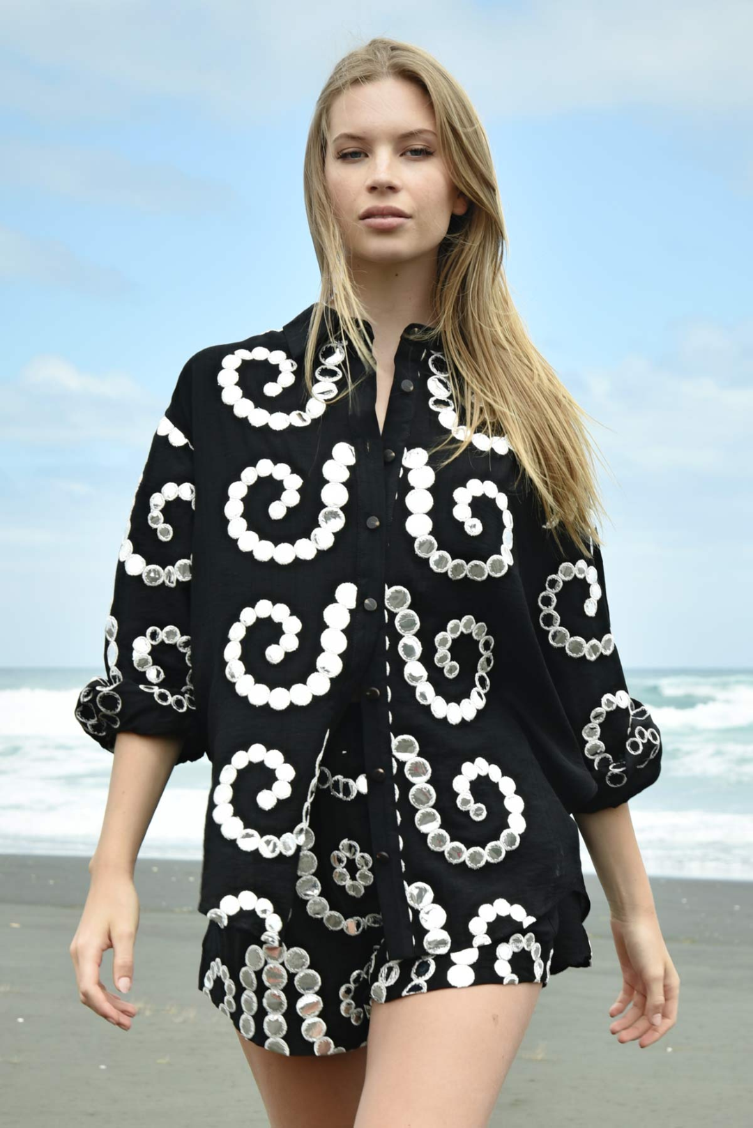 Sporting a casual style with a glamourous touch the ‘Just Casually’ shirt dazzles with its soft mirror embroidery. Crafted in the draped ‘A Mirror Party’ cotton rayon blend, this shirt is cut in a boyfriend style and embellished with soft, mirrored discs. Perfect for making a statement in a wearable way, this shirt can be teamed with jeans or pair it with the ‘The Short of it’ shorts for a co-ordinated look.