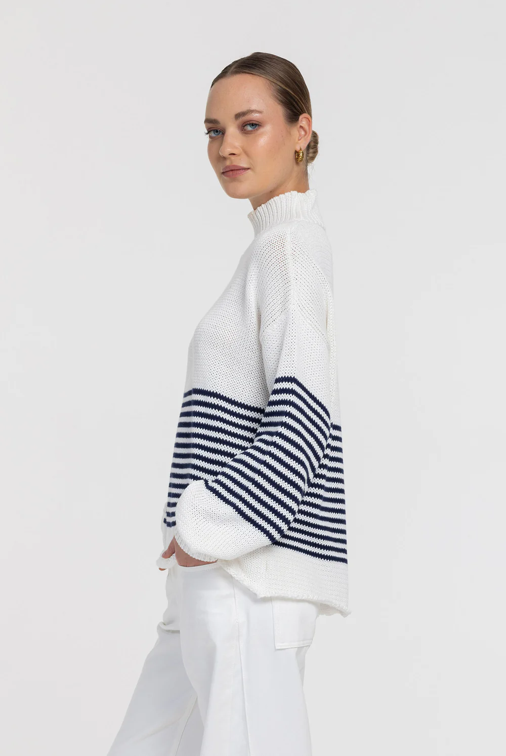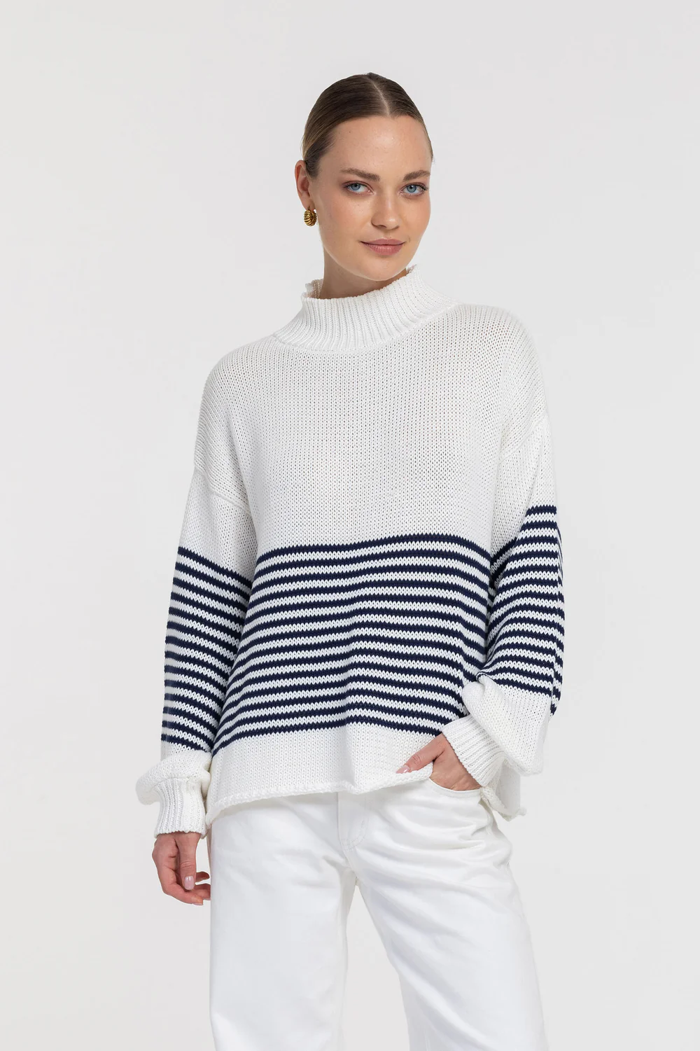 The ultimate throw-on knit—fresh, relaxed, and quietly cool. Kiki is crafted in breathable cotton yarn with a clean stand neckline and an easy, roomy shape that drapes just right. Bold navy stripes bring a timeless coastal feel, while the softly slouchy sleeves and ribbed finishes keep it cosy and polished. Perfect with our Drew Jean, tailored pants, or thrown over a slip for contrast