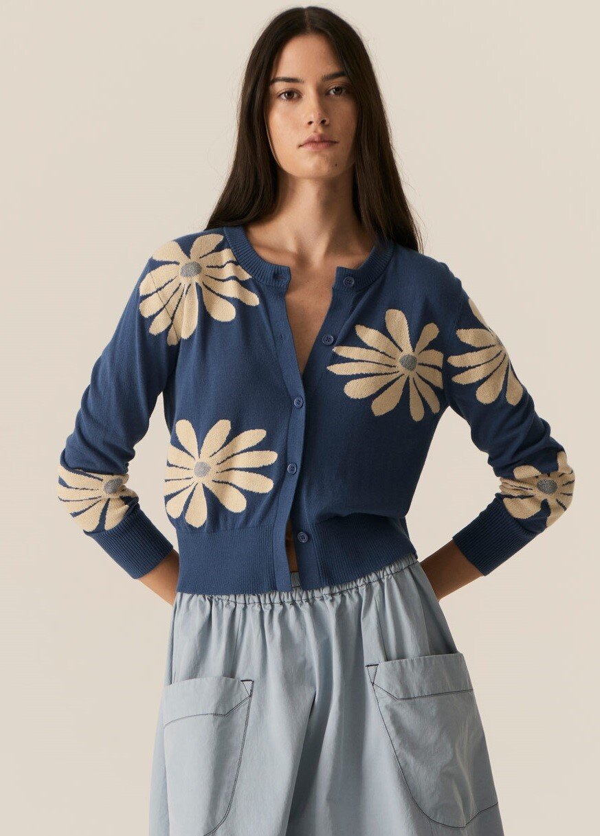 Add some playfulness to your Spring wardrobe with our Lask Daisy Cardigan! Made from our lightweight cotton yarn, the Lask features contrast Daisy intarsia with a lurex centre.