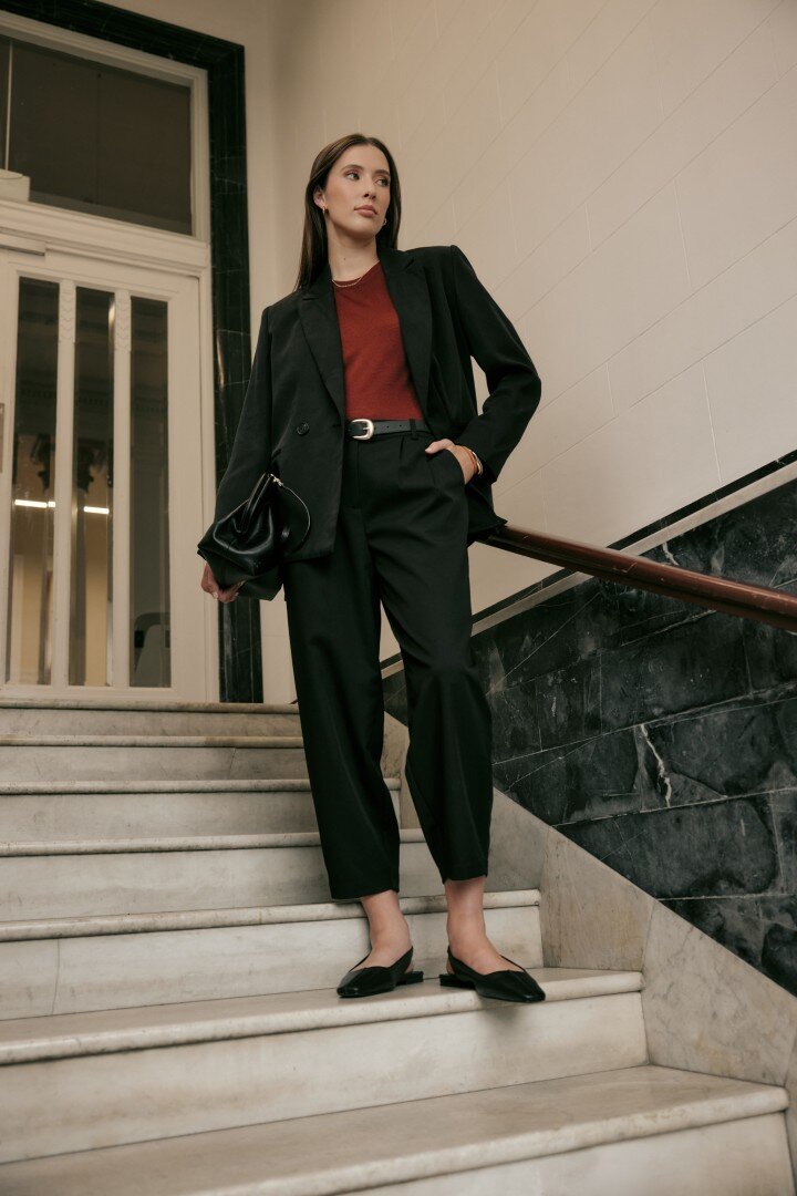 Meet the Marlow Ligne Pant - the Mode Pant’s chic sister, designed with a sleek, tapered fit. This tailored style features a slightly cropped length, front pleats, a front fly, and belt loops. The elasticated back waistband provides a perfect fit and all-day comfort. Effortlessly versatile, the Ligne Pant transitions from work to weekend- pair it with a blouse for office - ready polish, or a relaxed knit and sneakers for a casual brunch.