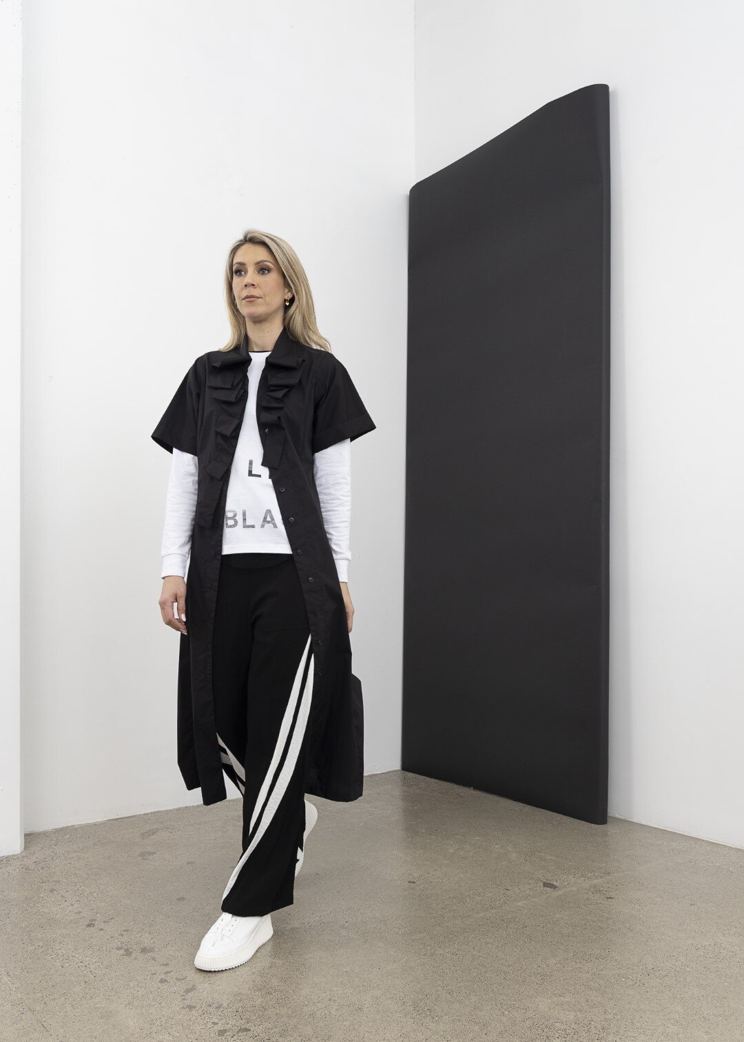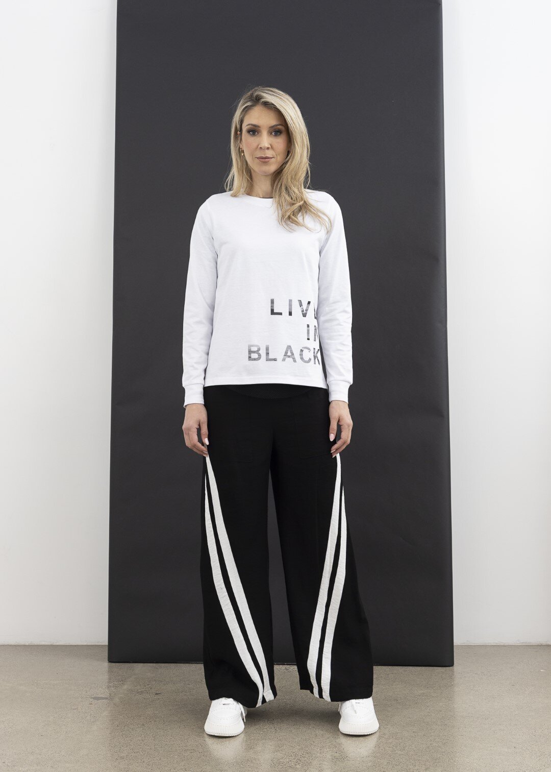 A striking wide leg black pant with twisted contrast white stripes that run from the outside hip to the inner ankle.Pair wit hyour favourite trainers and graphic tee for an effortless off-duty look