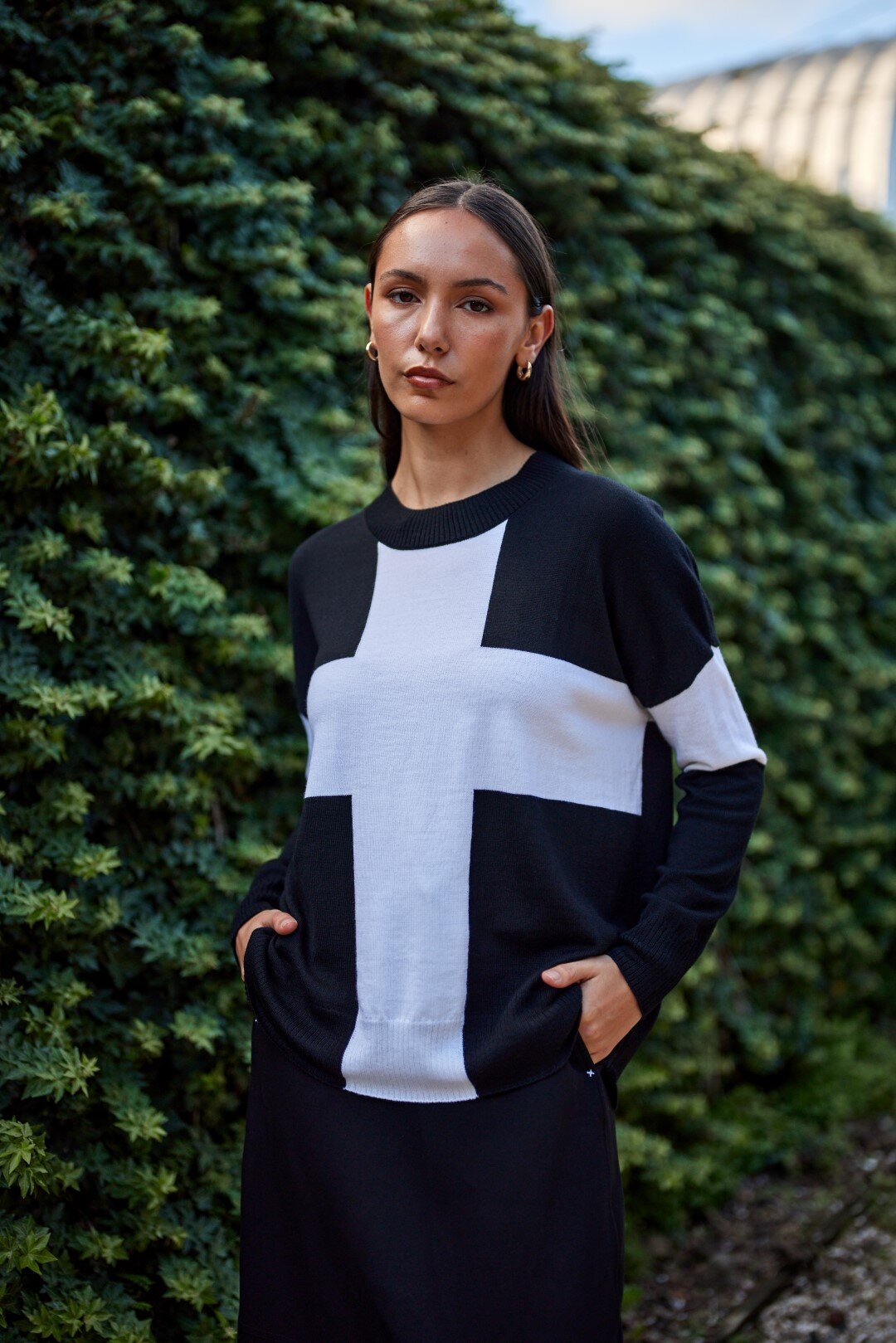Add bold style to your wardrobe with this black merino wool jumper featuring a striking design on the front, crafted from soft and breathable merino wool for all-day comfort. Complete with a classic round neckline and long sleeves, it offers a relaxed fit that is perfect for layering.