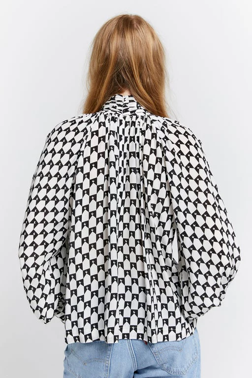 A beloved KW style, the Mouseion Organic Cotton Top, is reimagined for the change of season. The Meadow Bow Top exudes a feminine flair with a touch of drama. This relaxed silhouette heroes billowing long sleeves and an exaggerated pussycat bow, tying neatly at the collar. Crafted in silk crepe de chine, adorned with the latest custom KW Monogram print. The top is completed with a zip closure at the back and finishes at hip length making it versatile enough to be worn loose or tucked in.