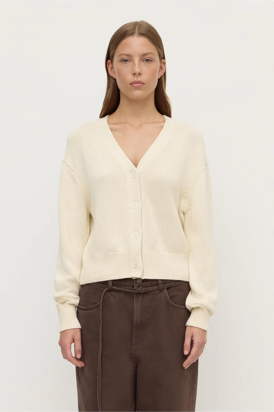 The Meri Knit Cardigan in cream is a 100% cotton cardigan with a V-neckline and button down front.